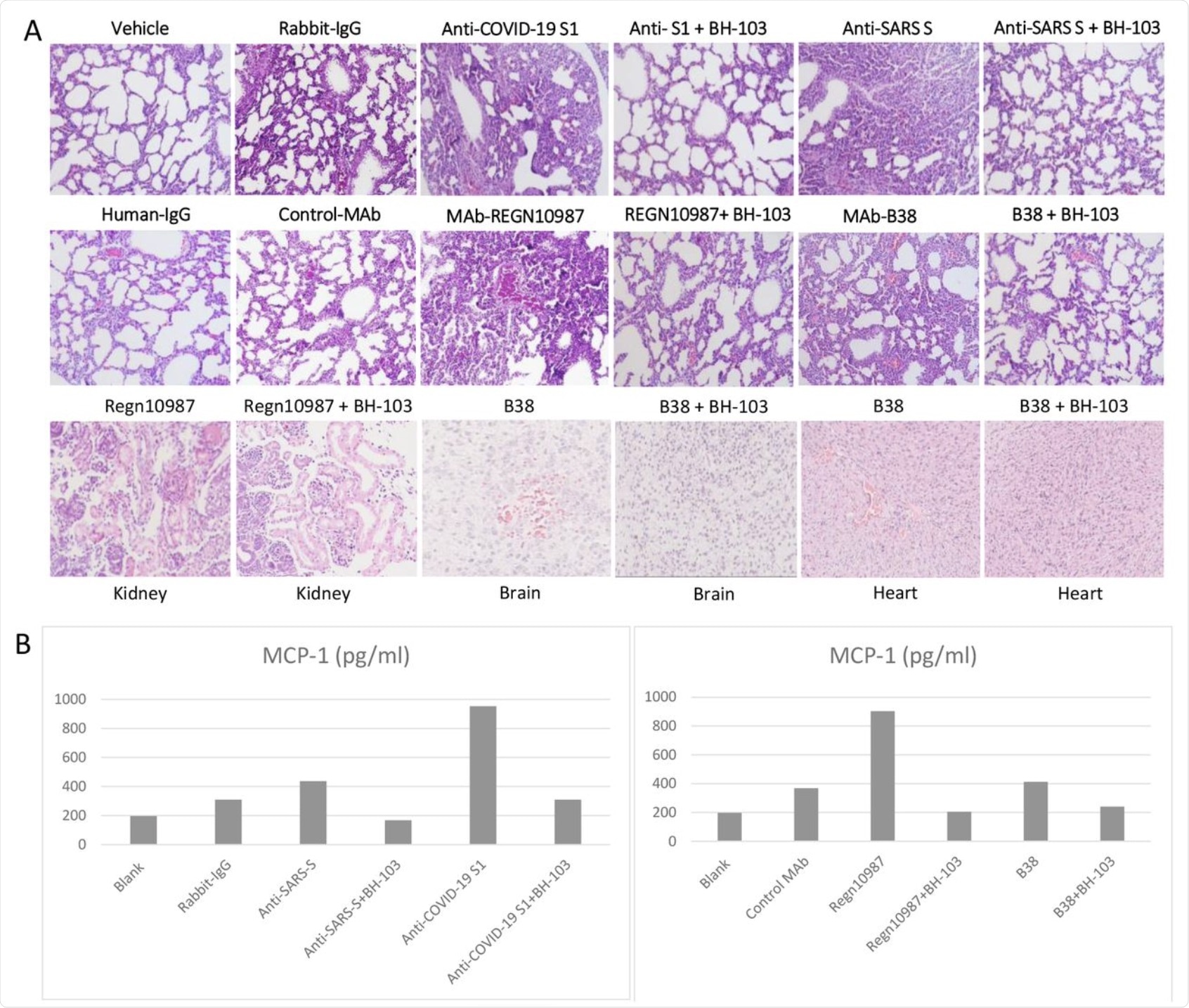 A: The representative images of the histological changes of lungs (top 2 rows), kidneys, brains, and hearts (bottom row) from the newborn mouse pups born to the dames injected with pathogenic anti-coronavirus antibodies of anti-Covid-19 S1, anti-SARS S, and human monoclonal anti-COVID-19 S1 antibodies (MAb) REGN-10987 and B38, and control antibodies of human IgG, rabbit IgG and CR3022-b6 (Control MAb); or the dames treated with BH-103 and antibody. B: The cytokine levels of MCP-1 in mouse sera from the newborn mouse pups born to the dames with antibody injection alone or the dames treated with BH-103 and antibody.