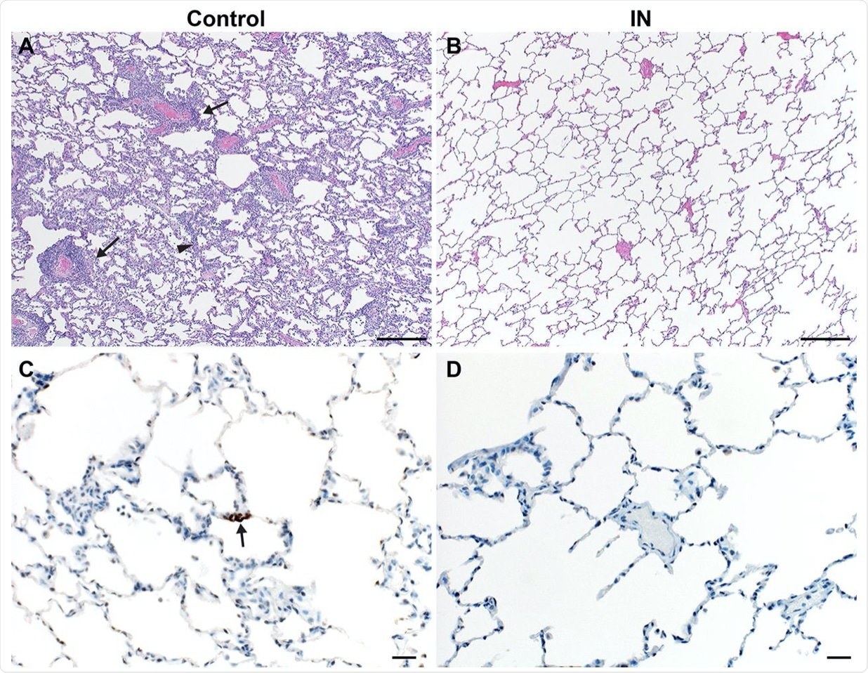 Lung pathology is reduced in ChAdOx1 nCoV-19 IN-vaccinated rhesus macaques after SARS-CoV-2 challenge. (A and B) Lung tissue sections isolated from IN-vaccinated (A) and control (B) rhesus macaques were stained with hematoxylin and eosin. Scale bar = 200μm. (A) Interstitial pneumonia (arrowhead) and lymphocytic perivascular cuffing (arrow) were observed in control samples. (B) No pathology was observed in IN-vaccinated lung samples. (C and D) Immunohistochemistry for SARS-CoV-2 antigen (brown) reveals rare type I pneumocyte immunoreactivity (arrow) in control samples (C) but no immunoreactivity in IN-vaccinated samples (D). Scale bar = 20μm.