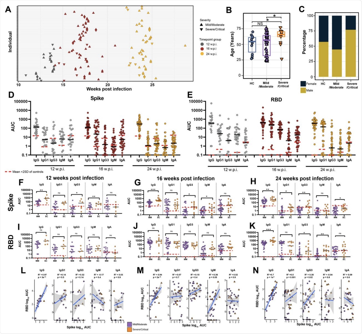 (A) Blood sample collection timepoints. (B) Age and (C) sex distribution of healthy controls (HC) in comparison to mild/moderate and severe/critical COVID-19 convalescents. (D) Anti-Spike and (E) anti-RBD specific IgG, IgG1, IgG3, IgM and IgA titres at 12, 16, and 24 w.p.i. End point titers are reported as area under the curve (AUC). The mean is denoted by the horizontal black lines. Seronegative samples were assigned a value of 0.1. Red dashed lines represent the mean AUC + 2 SD in HC for each isotype. (F-K) Antibody titres subdivided by disease severity. (L-M) Pearson correlations between anti-Spike and anti-RBD antibody subclass titres at each timepoint. Statistical significance was assessed in (B,F-K) using Wilcoxon Rank Sum Tests. ns= non-significant. * P < 0.05, ** P < 0.01, *** P < 0.001.
