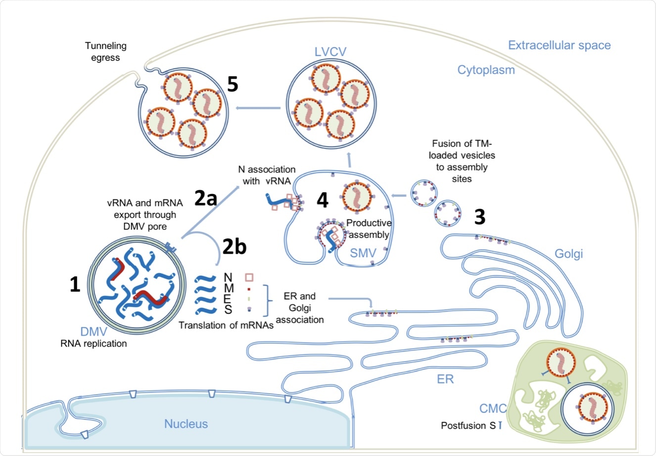(1) Viral genome replication occurs inside the DMVs, generating the negative-strand viral and subgenomic RNAs (red), positive vRNA genomic copy, and subgenomic mRNAs (blue). (2) Positive RNAs are exported to cytoplasm through the DMV pores. Subgenomic mRNAs are translated (2b). Structural proteins M, E, and S associate with ER and Golgi membranes. Genomic vRNA becomes complexed with newly synthetized N (2a). (3) S, E, and M are transported in dense vesicles, which are fused with SMVs. (4) Productive viral assembly happens in the SMV clustering the viral spikes and encapsidating the genome in RNPs. Viruses bud to the internal space of the SMV. (5) Egress occurs through tunnels. The complex membrane compartment (CMC) is depicted in green, which encloses both postfusion spike-containing virus particles and prefusion spike-containing virus particles. DMV double membrane vesicle, SMV single membrane vesicle, CMC complex membrane compartment, LVCV large virus-containing vesicle.