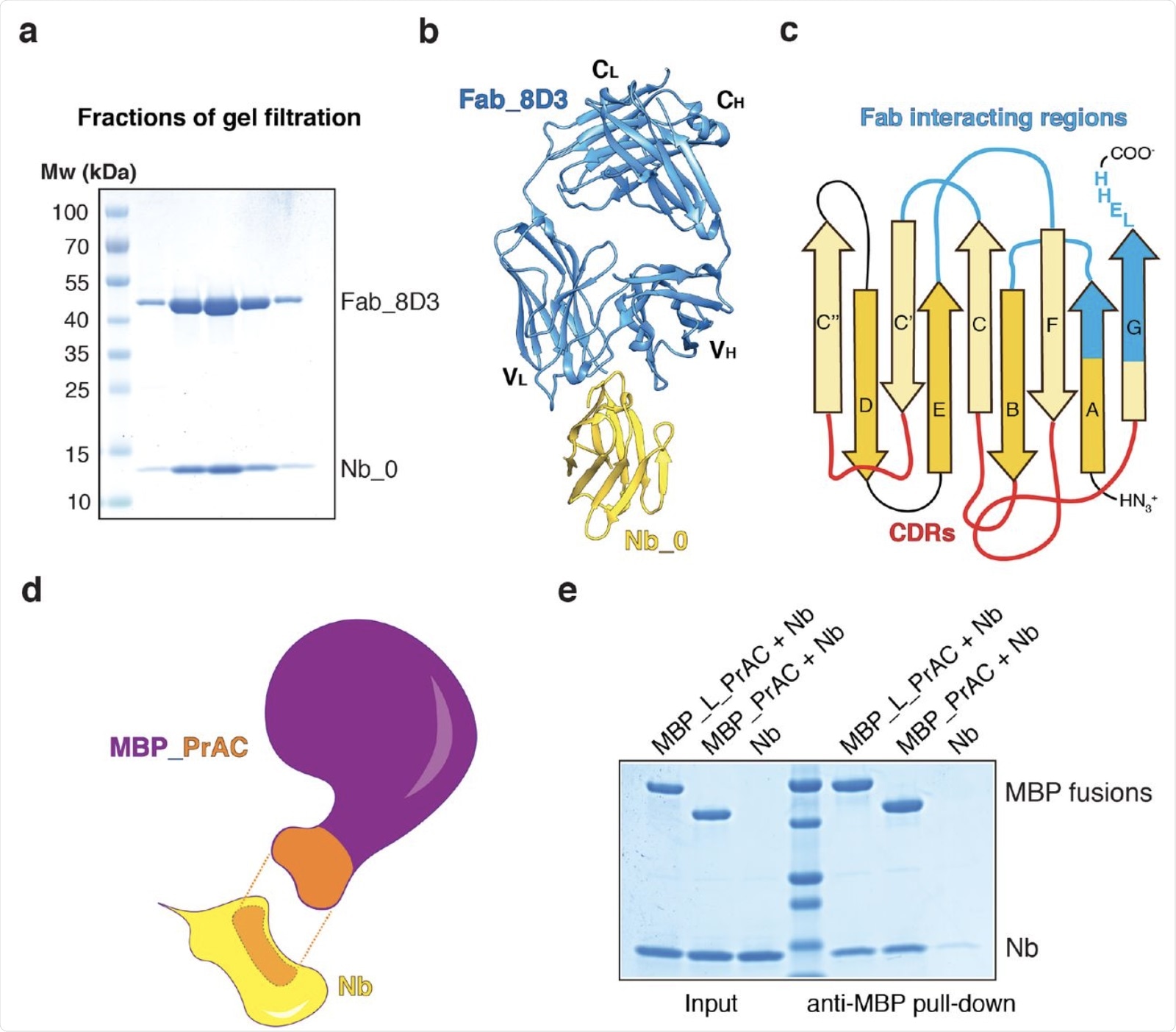Generation of two nanobody-interacting scaffolds. a. Nanobody Nb_0 was mixed with Fab_8D3 and the complex was subjected to gel filtration. Fractions were analyzed by SDS-PAGE and Coomassie-blue staining. b, Crystal structure of the Nb_0/Fab_8D3 complex shown in cartoon representation. Nb_0 is colored in yellow and Fab_8D3 in blue. c, Scheme of the nanobody, with β-strands labeled according to convention. CDR loops are colored in red and regions interacting with the Fab in blue. d, Scheme of the interaction of nanobody (Nb; yellow) with the domain C of protein A (PrAC; orange) grafted onto maltose-binding protein (MBP; purple). The interacting regions between Nb and MBP_PrAC are shown in orange with dashed lines in between. e, PrAC fused to MBP through a flexible linker (MBP_L_PrAC) or grafted onto MBP (MBP_PrAC) was mixed with Nb. The mixture was incubated with MBP-interacting amylose resin, and the bound material analyzed by SDS-PAGE and Coomassie-blue staining. The input corresponds to 50% of the material used for the pull-down.