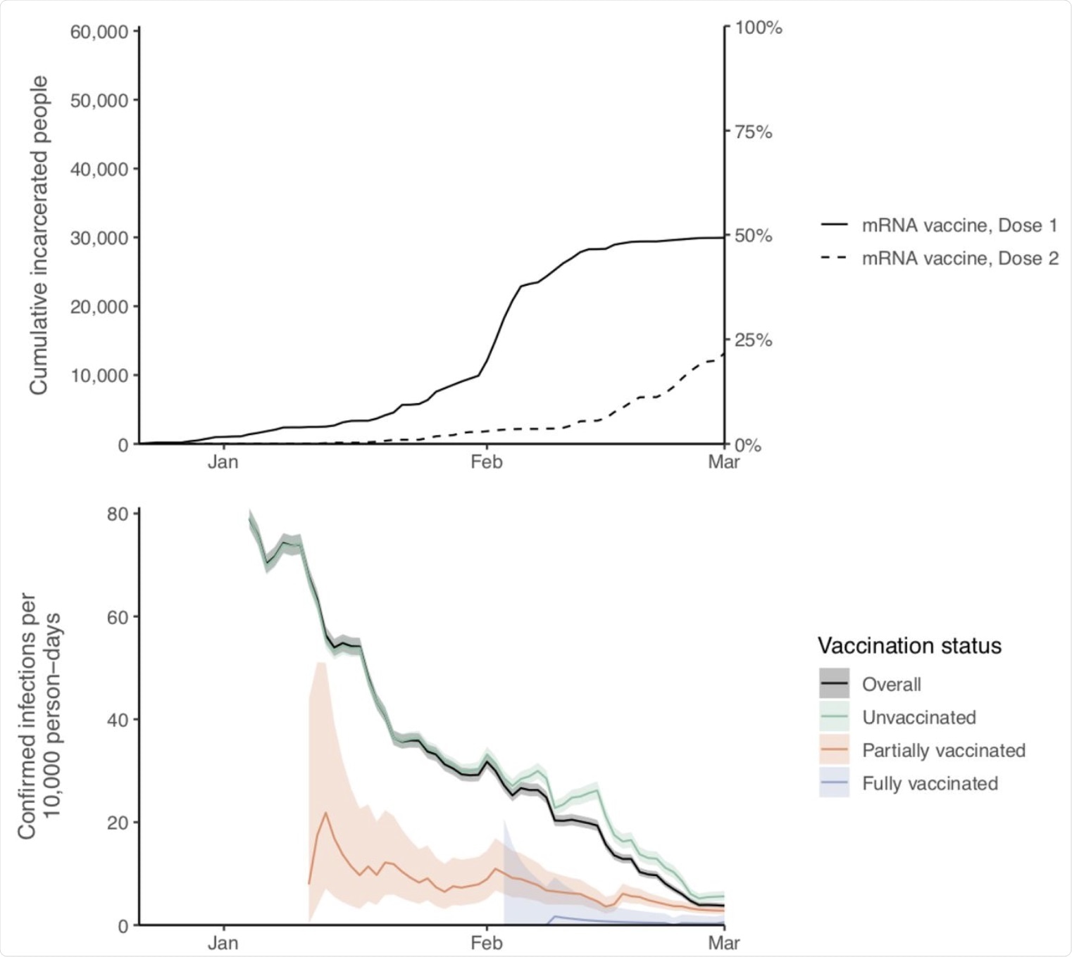 Cumulative vaccinations with one or two doses of mRNA vaccines (top panel) and 14-day rolling rates of confirmed infections per 10,000 person-days by vaccination status (bottom panel), among study cohort of incarcerated people in California state prisons.* Shaded areas represent 95% confidence intervals. Partially vaccinated status defined as ≥14 days after a first dose until receipt of a second dose; fully vaccinated status defined as ≥14 days after a second dose. * Time periods with fewer than 200 people tested were excluded.