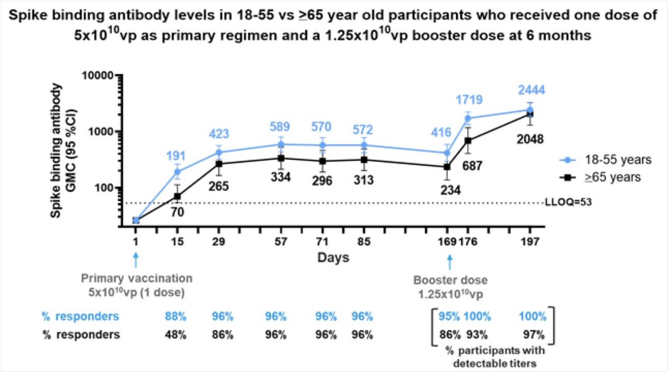 Phase 2 participants 18–55 (N=50) and ≥65 (N=25) years of age, were administered a single dose of Ad26.COV2.S (5×1010 vp) as primary vaccination at Day 1 and 73 received a booster dose of Ad26.COV2.S (1.25×1010 vp) at 6 months (Day 169) post primary vaccination. Serum spike binding antibody responses against SARS-CoV-2 were evaluated by S-ELISA up to 28 days post boost (Day 197). Participants 18–55 and ≥65 years of age are represented with blue and black lines, respectively. GMCs are depicted above each time point and response rates are illustrated at the bottom of each panel.