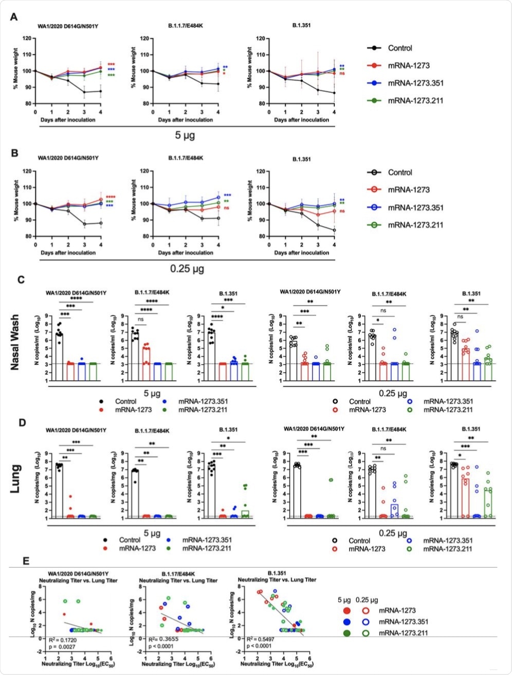 Seven to nine-week-old female 129S2 mice were immunized and boosted with 5 or 0.25 μg of mRNA vaccines (control (black symbols), mRNA-1273 (red symbols), mRNA-1273.351 (blue symbols), and mRNA-1273.211 [mixture, green symbols]) as described in Figure 1A. Three weeks after boosting, mice were challenged via intranasal inoculation with 105 focus-forming units (FFU) of WA1/2020 N501Y/D614G, B.1.1.7/E484K, or B.1.351. A-B. Body weight change over time. Data shown is the mean +/− SEM (n = 6-9, two independent experiments; one-way ANOVA of area under the curve from 2-4 dpi with Dunnett’s post-test, comparison to control immunized group: ns, not significant; P > 0.05; *, P < 0.05; **, P < 0.01; ***, P < 0.001; **** P < 0.0001). C-D. Viral burden at 4 dpi in the nasal washes (C) and lungs (D) as assessed by qRT-PCR of the N gene after challenge of immunized mice with the indicated mRNA vaccines (n = 6-8, two independent experiments, boxes illustrate median values, dotted line shows LOD; one-way Kruskal-Wallis ANOVA with Dunn’s post-test, comparison among all immunization groups: ns, not significant; P > 0.05; *, P < 0.05; **, P < 0.01; ***, P < 0.001; **** P < 0.0001). E. Correlation analyses comparing serum neutralizing antibody concentrations three weeks after boosting plotted against lung viral titer (4 dpi) in 129S2 mice after challenge with the indicated SARS-CoV-2 strain (Pearson’s correlation P and R2 values are indicated as insets; closed symbols 5 μg vaccine dose; open symbols, 0.25 μg vaccine dose).