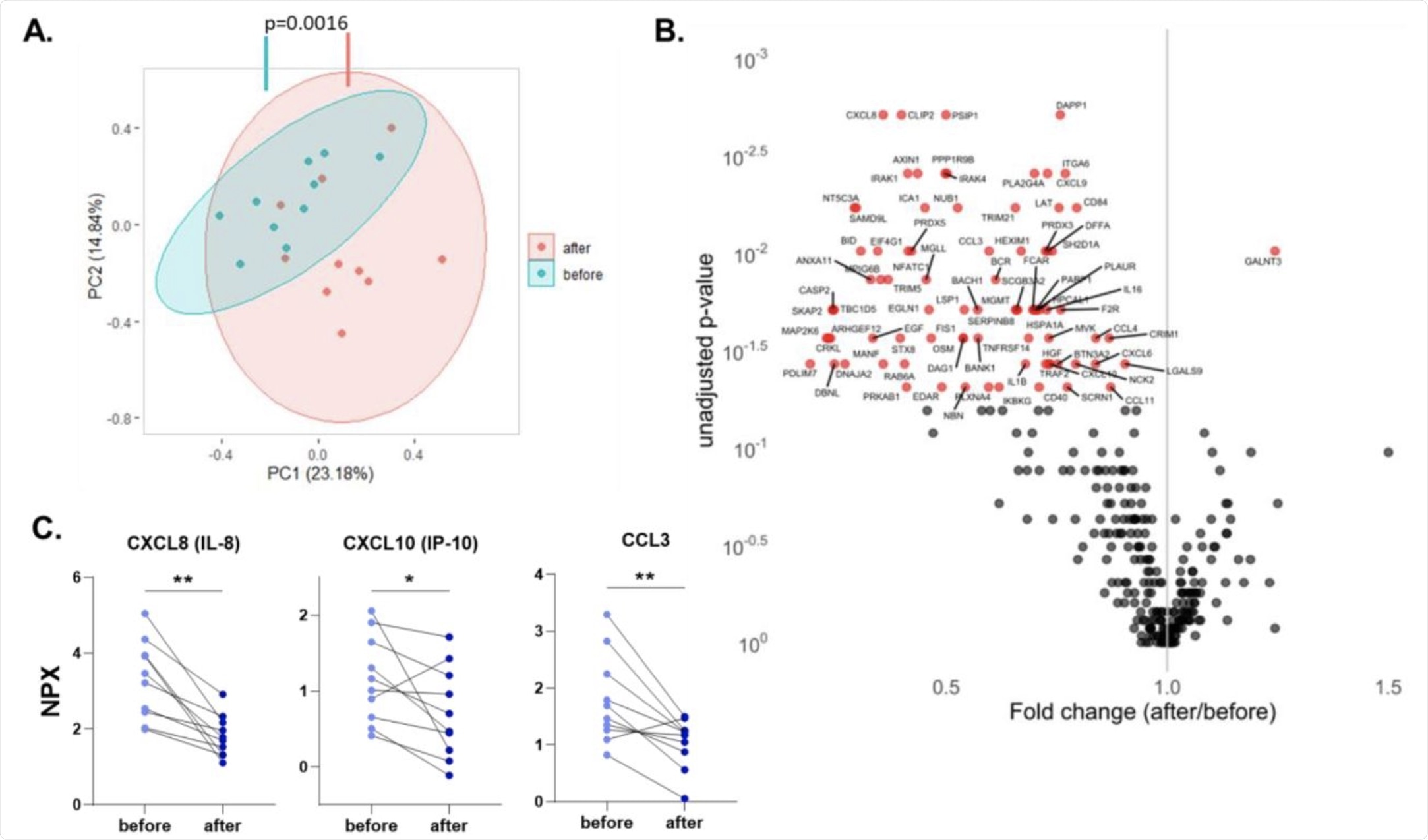 A. Principal component analysis (PCA) of circulating proteins belonging to 10 participants before and after vaccination. The mean difference between before and after in PC1 was calculated by Wilcoxon signed-rank test. B. Volcano plot depicting the fold changes after influenza vaccination. Red dots show significantly changing proteins. C. Selected chemokines whose abundances significantly decrease after the vaccination. Differences between protein expressions before and after influenza vaccination were analyzed using the Wilcoxon signed-rank test, n=10. NPX: Normalized protein expression. *p<0.05, **p<0.01.