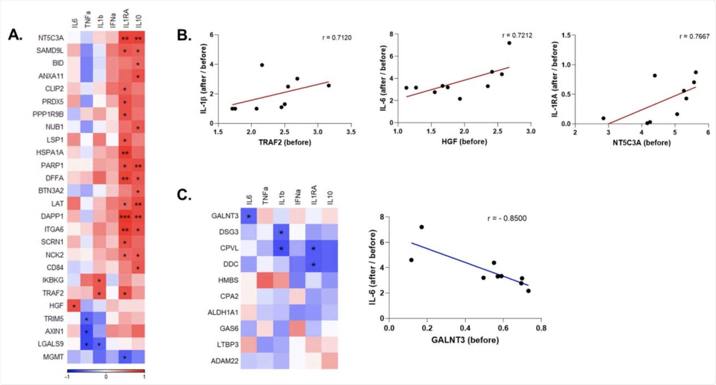 A. Heatmap depicting the baseline (before vaccination) levels of inflammatory mediators that were downregulated by influenza vaccination and are significantly correlated with the induction of cytokines upon SARS-CoV-2 stimulation before vs. after vaccination. Red indicates positive correlation, and blue indicates negative correlation. B. Selected circulating protein and cytokine pairs that are significantly correlated. C. Correlation of circulating proteins that were upregulated by influenza vaccination with anti-SARS-CoV-2 cytokine responses, and dot plot depicting the association of baseline GALNT3 levels and induction IL-6 against SARS-CoV-2 after vaccination. r: Spearman’s correlation coefficient. *p<0.05, **p<0.01, ***p<0,001.
