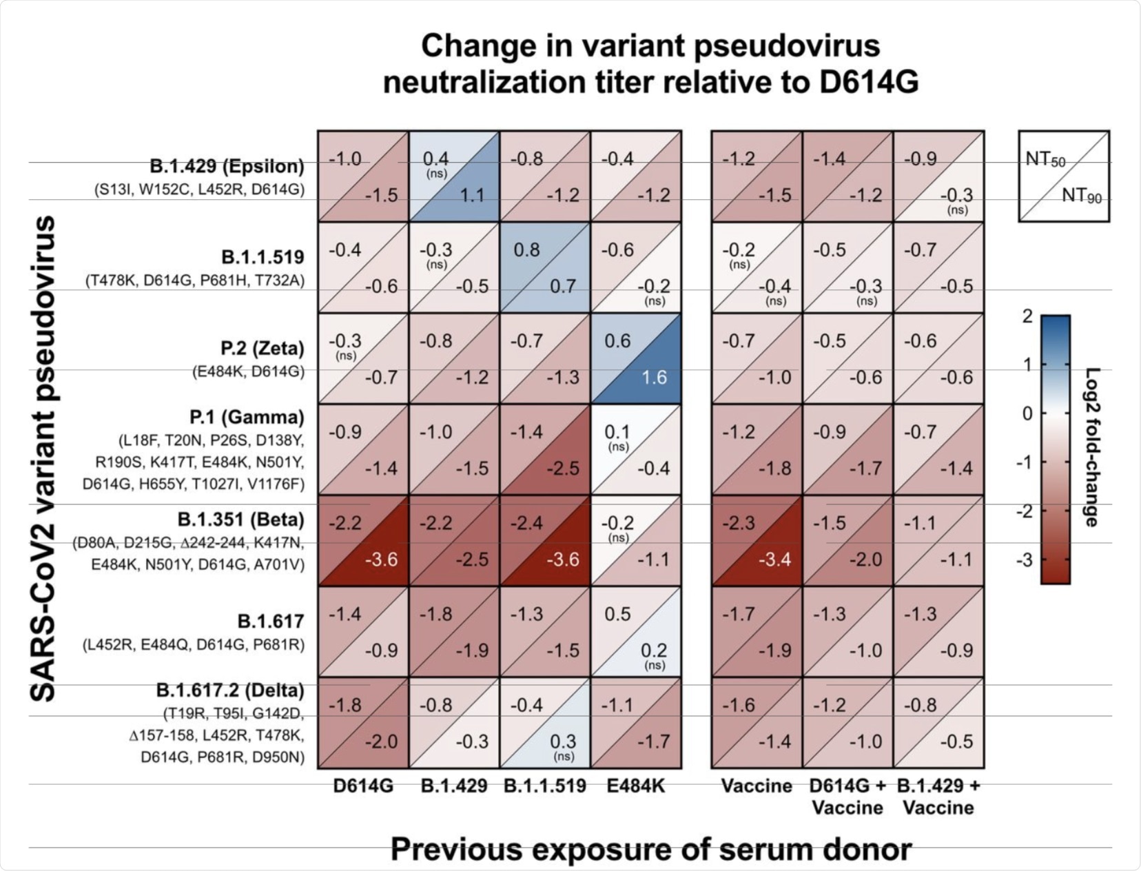 Matrix of normalized neutralization titers for seven different variant pseudoviruses (rows) neutralized by seven different pools of individual sera grouped by exposure (columns). Data is represented as a heat map of the Log2 fold-change in NT50 (top left of each box) and NT90 (bottom right of each box) of each variant relative to D614G pseudovirus. All serum samples were collected at least 14 days after the date of the subject’s positive COVID-19 test or date of second vaccine dose. All titer measurements are the mean of at least three independent experiments, each performed with two technical replicates. Positive Log2 fold-change (blue) indicates an increase in neutralization titer for that variant relative to D614G pseudovirus, while negative Log2 fold-change (red) indicates a decrease relative to D614G. Statistical significance was determined with unpaired t-tests. All values are statistically significant (P-value < 0.05) except where noted with “ns” to indicate the difference in variant neutralization titer is not significantly different from D614G titer in that serum pool.