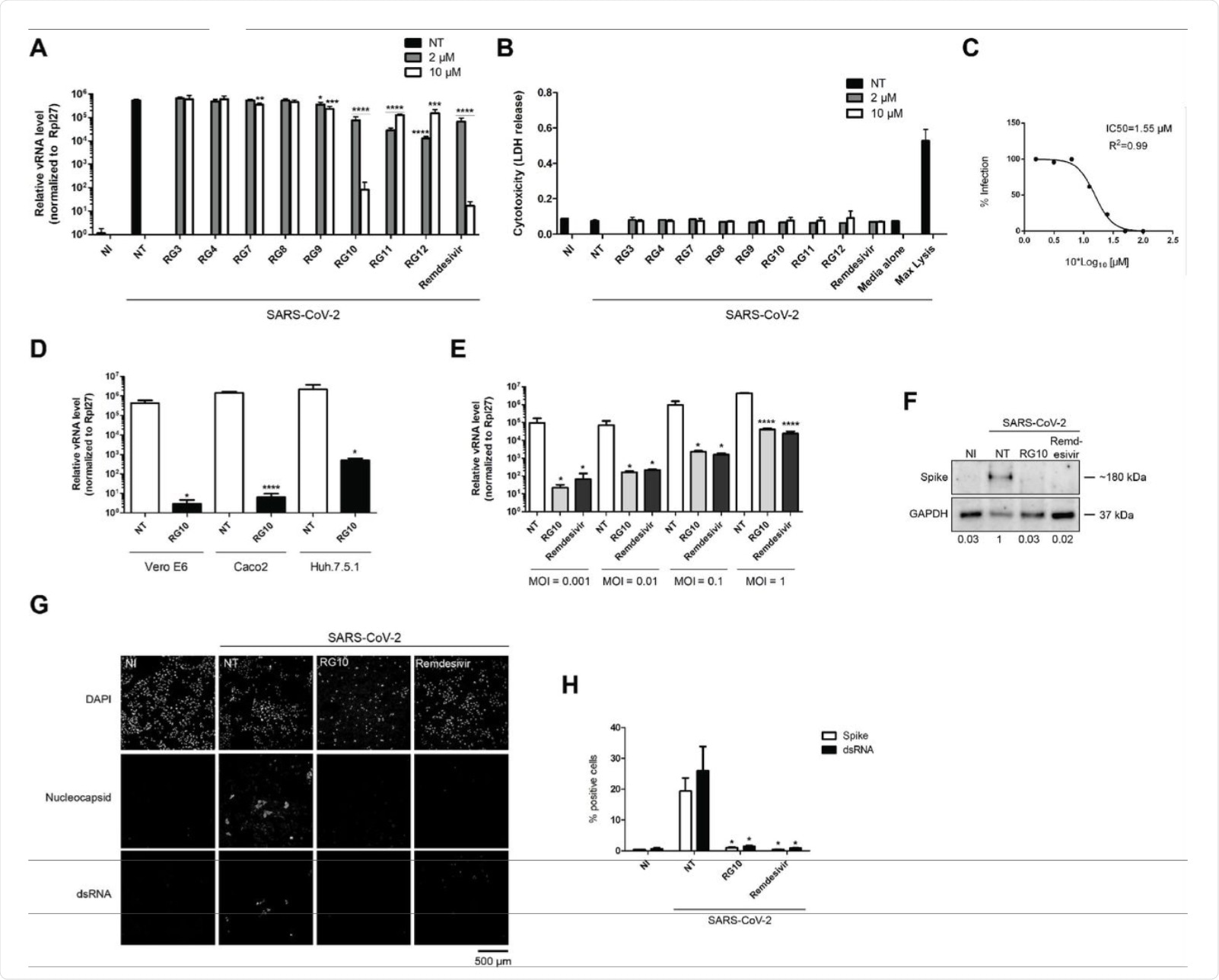(A-B) Vero E6 cells were treated with the indicated RG derivatives or Remdesivir at indicated concentrations and subsequently infected with SARS-CoV-2 at MOI 0.01 for 48 h in the presence of the compounds. (A) The graph shows relative SARS-CoV-2 RNA (vRNA) levels measured by RT-qPCR and normalized by Rpl27 RNA expression. The bars are means +/- SD from duplicates representative of two independent experiments. Student’s t-test ** p value < 0.01; *** p value < 0.005; **** p value < 0.001. (B)Cytotoxicity measured by LDH release assay showed no significant differences between the compounds. (C) Vero E6 cells were treated with RG10 at various concentrations and subsequently infected and processed as in A. The IC50 was 1.55 µM +/- 0.11 as measured from three independent experiments. (D) Vero E6 (monkey kidney cells), Caco2 (human intestinal cells) or Huh7.5.1 cells (human liver cells), were treated with 10 µM RG10 and subsequently infected with CoV2 at MOI 0.01 for 48 h in the presence of the compounds. The graph shows relative CoV2 RNA (vRNA) levels measured by RT-qPCR and normalized by Rpl27 RNA expression. The bars are means +/- SD from duplicates representative of two independent experiments. Student’s t-test ** p value < 0.01; *** p value < 0.005; **** p value < 0.001. (E) Huh7.5.1 cells were treated with 10 µM RG10 or 10 µM Remdesivir and subsequently infected with CoV2 at indicated MOI for 48 h. The graph shows relative vRNA levels measured by RT-qPCR and normalized by Rpl27 RNA expression. The bars are means +/- SD from duplicates representative of two independent experiments. Student’s t-test * p value < 0.05 and **** p value < 0.001. (F) Huh7.5.1 cells were treated with 10 µM RG10 or 10 µM Remdesivir and subsequently infected with SARS-CoV-2 at MOI 0.5 for 48 h. Cells were then lysed 48 h post infection. The lysates were processed for western blotting using an anti SARS-CoV-2 Spike antibody and an anti-GAPDH antibody as loading control. Both immunostainings were revealed using secondary antibodies coupled to HRP. (G) Cells were infected as in F then fixed and stained using an anti SARS-CoV-2 Nucleocapsid antibody and a J2 antibody recognizing double stranded RNA (dsRNA) representative of viral replication complexes. The micrographs show the individual channels that have been acquired using a confocal microscope and processed using ImageJ. (H) Samples were treated as in F and cells were detached and fixed 48 h post infection. Samples were stained and analyzed by flow cytometry. Student’s t-test * p value < 0.05.