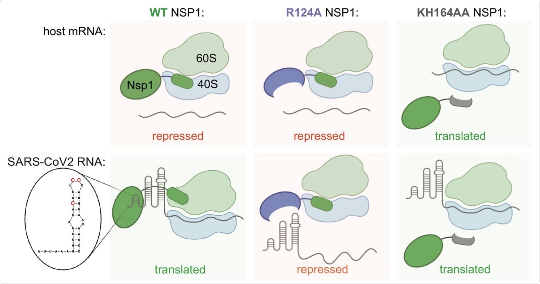 Upon further analysis of the protein by BioID, NSP1 was found to block host translation by inserting its C-terminal domain into the mRNA entry tunnel on the ribosomal 40S subunit. In doing so, NSP1 blocked ribosomal host-protein synthesis and exported the viral mRNAs into the system. An artificially constructed non-functional mutant KH164AANSP1 could not replicate the mechanism of the wild-type NSP1 as effectively.