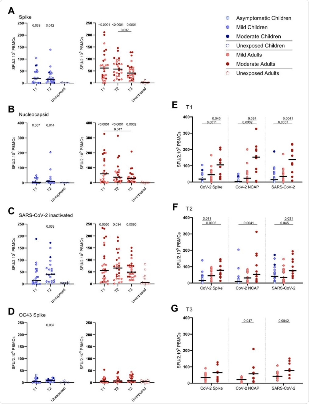 The researchers of the current study compared the specific T-cell responses against SARS-CoV-2 in 27 adults and 24 children with the infection, versus unexposed matched individuals. Blood samples were taken at a median of 12.5 days and 8 days from symptom onset in adults and children, respectively.