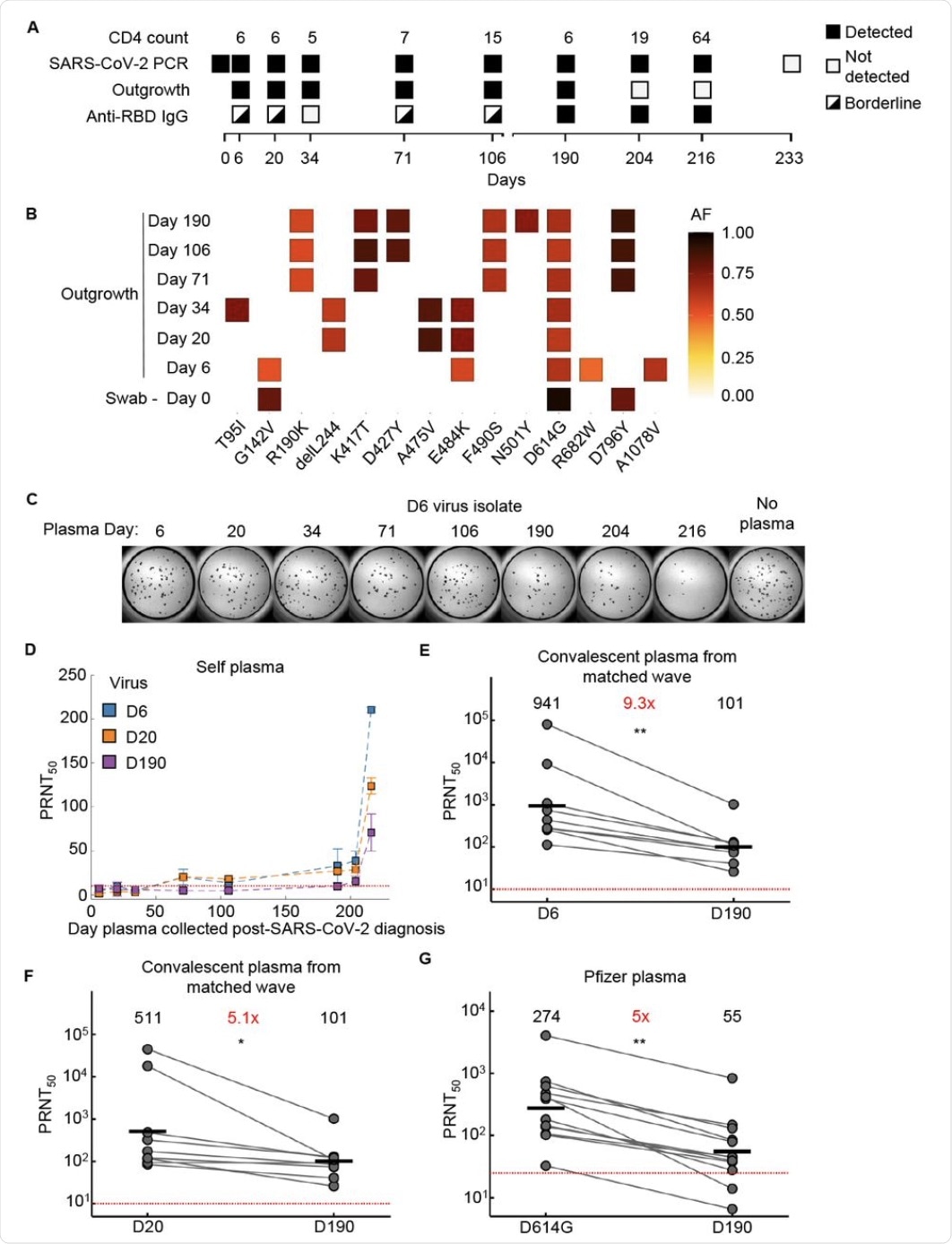 (A) Participant characteristics over 233 days from SARS-CoV-2 diagnosis including CD4 T cell count (cells/µL), presence or absence of SARS-CoV-2 by qPCR, success or failure of live virus outgrowth from swab sample, and presence or absence of anti-RBD IgG by ELISA. Because IgG levels were close to the background cutoff for some timepoints, they were marked as borderline. (B) Majority and minority SARS-CoV-2 genotypes in the swab (day 0) and outgrowth (day 6 to 190) sequences. X-axis lists substitutions and deletions in spike sequence. AF: allele frequency. (C) Live virus neutralization assay of the early day 6 (D6) SARS-CoV-2 virus isolate by self-plasma collected at days 6 to 216. Plasma dilution shown is 1:20. (D) Neutralization of D6, day 20 isolated (D20), and day 190 isolated (D190) virus by self-plasma collected days 6 to 216. (E) Neutralization of D6 virus relative to D190 virus by convalescent plasma of participants (n=8) infected by ancestral strains. Number in black above virus name is geometric mean of the PRNT50 and number in red represents fold-change of geometric mean between virus on the left and on the right of graph. (F) Neutralization of D20 isolate compared to D190 isolate by convalescent plasma from the same participants as in (E). (G) Neutralization of D190 isolate compared to ancestral virus (D614G) by Pfizer BNT162b2 elicited plasma (n=12). p-values are * <0.05; ** <0.01-0.001 as determined by the Wilcoxon rank sum test. Red horizontal line in panels D to G denotes most concentrated plasma tested.