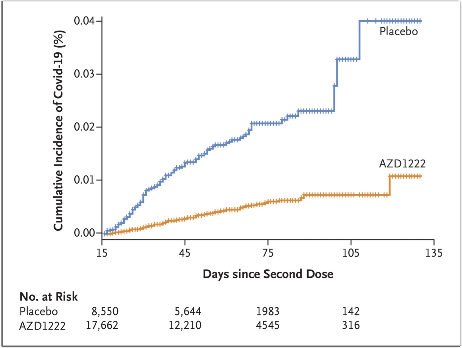 The AZD1222 vaccine appears to be safe and effective in preventing symptomatic COVID-19 among both young and older individuals. Two doses given at an interval of four weeks reduced symptomatic illness by 74% from 15 days after the second dose. Severe and critical cases were avoided altogether, while emergency room visits and hospitalizations were markedly reduced.