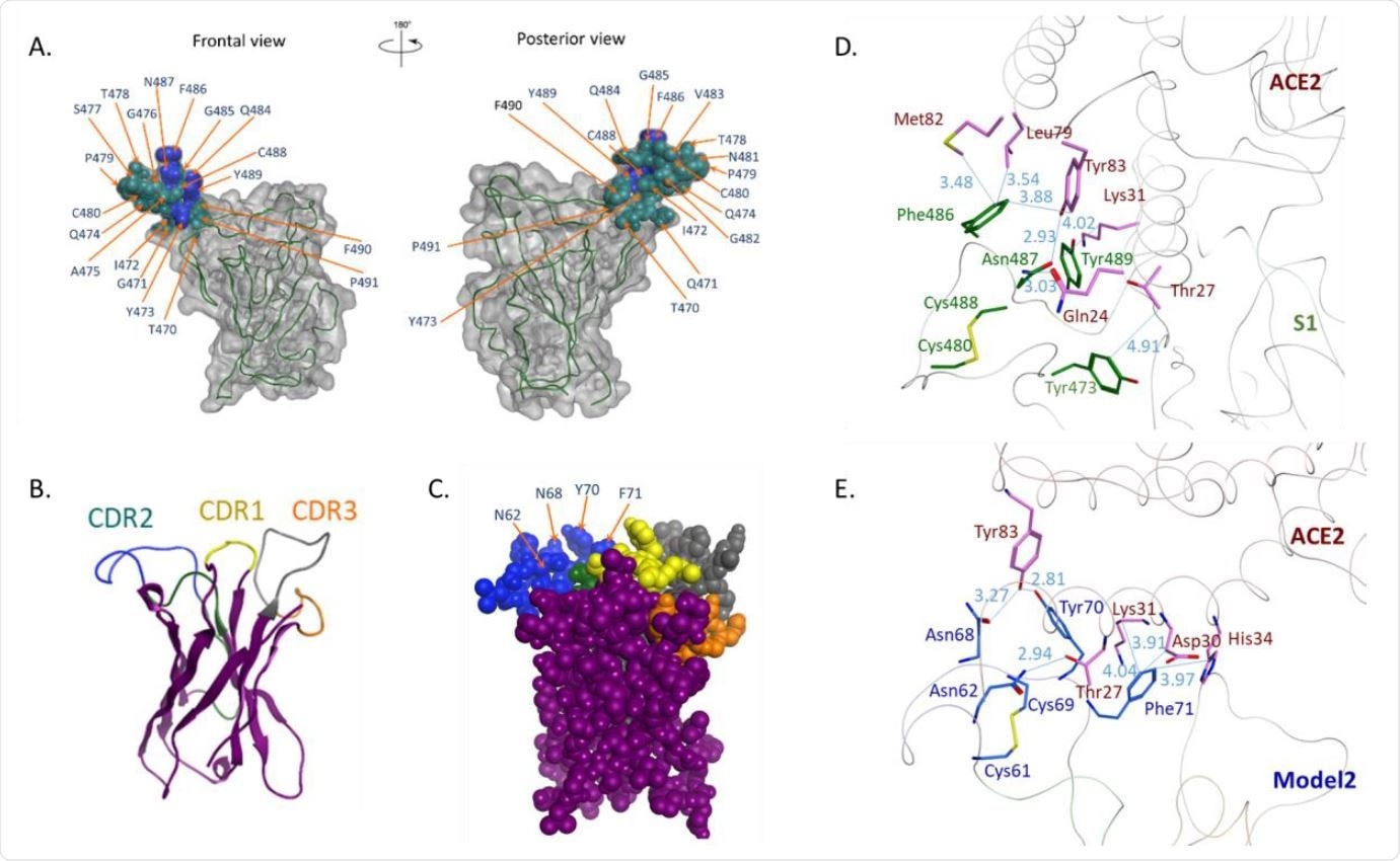 Conformational analysis of SARS2-CoV-2 RBM structure and predicted conformation of VH Model 2. In the Spike S1 protein (A) the tip of the RBM ridgeline is shown in dark green and the FNCY patch in dark blue. In Model 2 (ribbon B) and (space-filling C) the modeled CDR2 loop is shown in dark green, while the grafted RBM epitope is in dark blue. Panels on the right show the interface between ACE2 and SARS-CoV-2 RBM (D), and ACE2 and the CDR2 loop of Model 2 (E). Color scheme: A: gray - RBD; green - RBM; blue – ACE2 contact residues; B and C: yellow -CDR1; green - CDR2; orange - CDR3; blue - SARS-Cov-2 RBM residues grafted in CDR2; gray - tetanus toxoid epitope; D: pink - ACE2; green - SARS-Cov-2 RBM residues; E: pink - ACE2; blue - SARS-Cov-2 RBM residues grafted in CDR2.