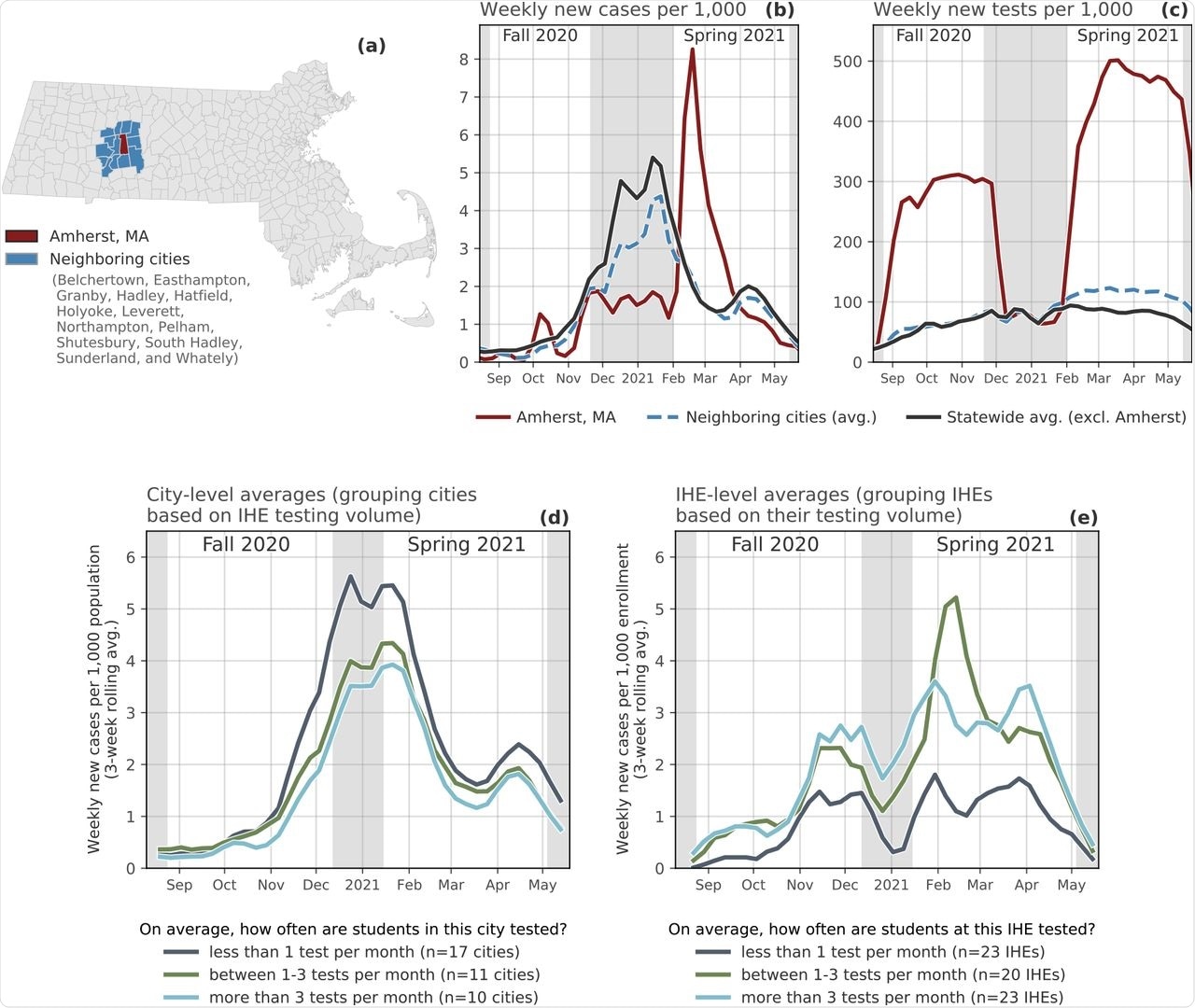Case Study: COVID-19 in Massachusetts college cities. Top: High-lighting testing and case counts in and around Amherst, Massachusetts. (a) Map of Massachusetts cities; in this map, the city of Amherst is red and the surrounding cities are colored blue. (b) Time series of weekly new cases per 1,000 in: Amherst, the surrounding cities, and the rest of Massachusetts. (c) Time series of weekly new tests per 1,000 in: Amherst, the surrounding cities, and the rest of Massachusetts. Bottom: Comparing outcomes of cities and IHEs with more/less IHE-affiliated testing. (d) City-level average weekly new cases per 1,000, grouped by cities with IHEs that test students on average fewer than once a month, between one and three times a month, and over three times a month (Note: we sought out city-level data for COVID-19 deaths, but the state does not report these). (e) IHE-level average weekly new cases, grouped by IHEs that test students on average fewer than once a month, between one and three times a month, and over three times a month.