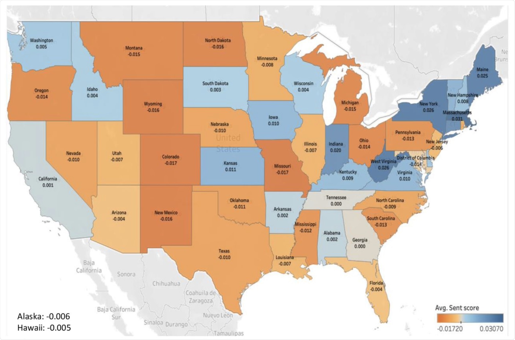 The average sentiment scores of tweets mentioning the vaccines varied from state to state. In general, these scores were higher in states on the east coast, such as Maine and New York, at 0.025 and 0.026, respectively, but low in Oregon or Colorado on the west coast, at -0.014 and -0.017, respectively.