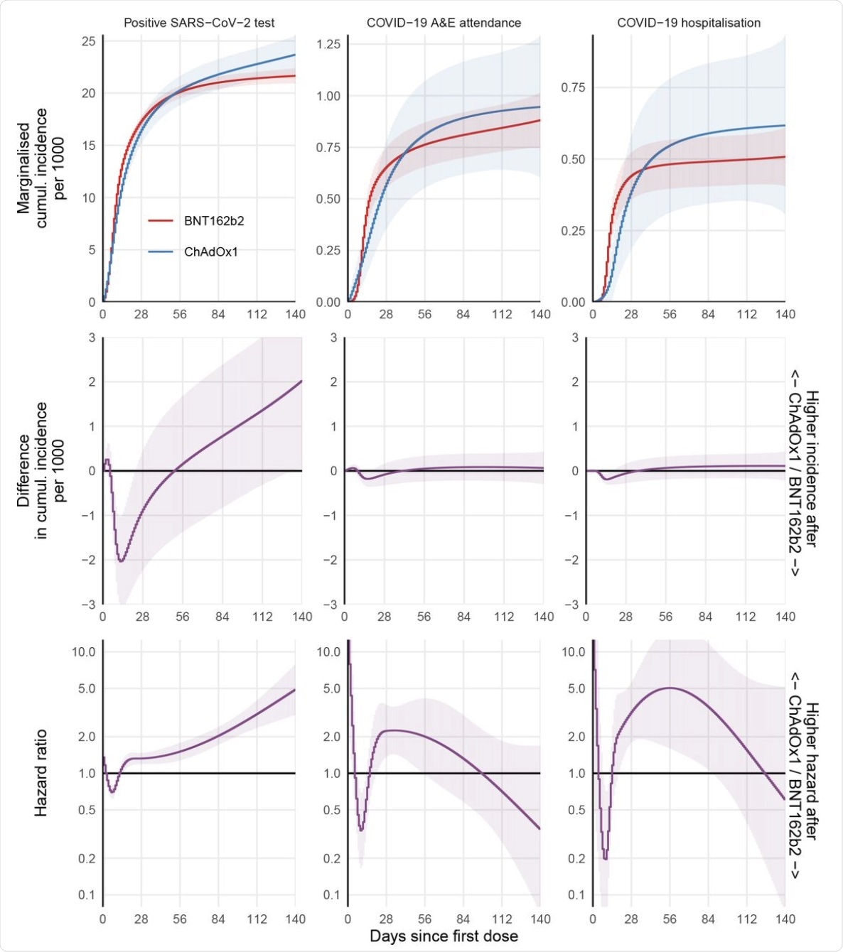 Direct comparisons of first and second dose effectiveness between the ChAdOx1 and BNT162b2 COVID-19 vaccines showed similar incidence rates for infection and COVID-19-related hospital attendance and admission. This indicates strong protective effects for both vaccines. The researchers called for further studies to assess comparative effectiveness in newer, more prevalent variants and to assess longer-term effectiveness.