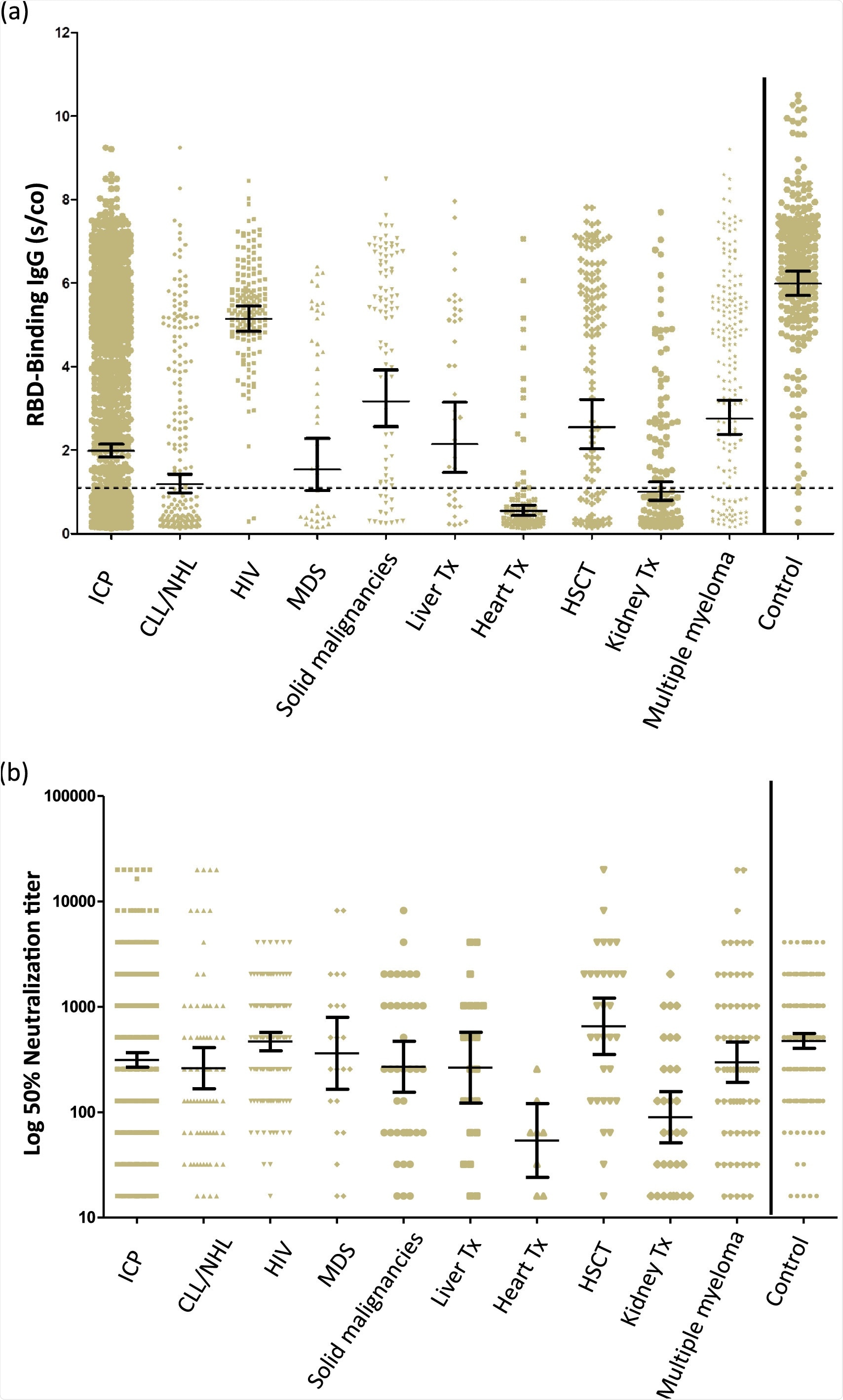 Quantitation of IgG following the second dose of the BNT162b2 vaccine in immunocompromised patients and immunocompetent health care workers. (A) RBD-IgG levels. (B) Neutralizing antibodies above the cutoff. The dotted black line indicates the limit level of positive antibodies. The short black line indicates GMT and 95% CI.