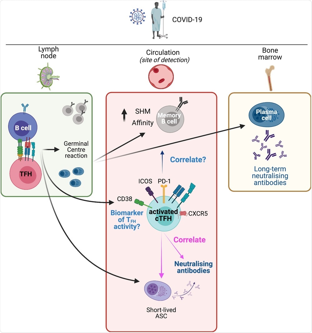 Lymphoid and circulating TFH responses in COVID-19. SARS-CoV-2 antigen in the lymph nodes results in activation of antigen-specific B cells and TFH cells. Their interaction leads to the initiation of the germinal center reaction. This results in the development of memory B cells with increased somatic hypermutation (SHM) and increased affinity, as well as long-lived plasma cells that traffic to the bone marrow and provide a long-term source of neutralizing antibodies. A population of short-lived antibody-secreting cells (ASCs) appears in the circulation and provides a raid source of neutralizing antibodies. Concurrently, a population of activated (CD38+, PD-1+, ICOS+) cTFH cells appears in the circulation. This population contains antigen-specific cTFH cells (not depicted). Although memory B cells and ASCs are primarily located in lymphoid tissues, they are typically measured in blood samples, where they correlate with activated cTFH cells. Activated cTFH cells also correlate with the development of neutralizing antibodies. These cTFH cells are a potential biomarker of TFH activity in lymphoid tissues but it remains to be determined if this population of cTFH cells are predictive of long-term neutralizing antibodies, or of the development of long-lived plasma cells and the prolonged evolution of the MBC pool. The figure was created with BioRender.com.