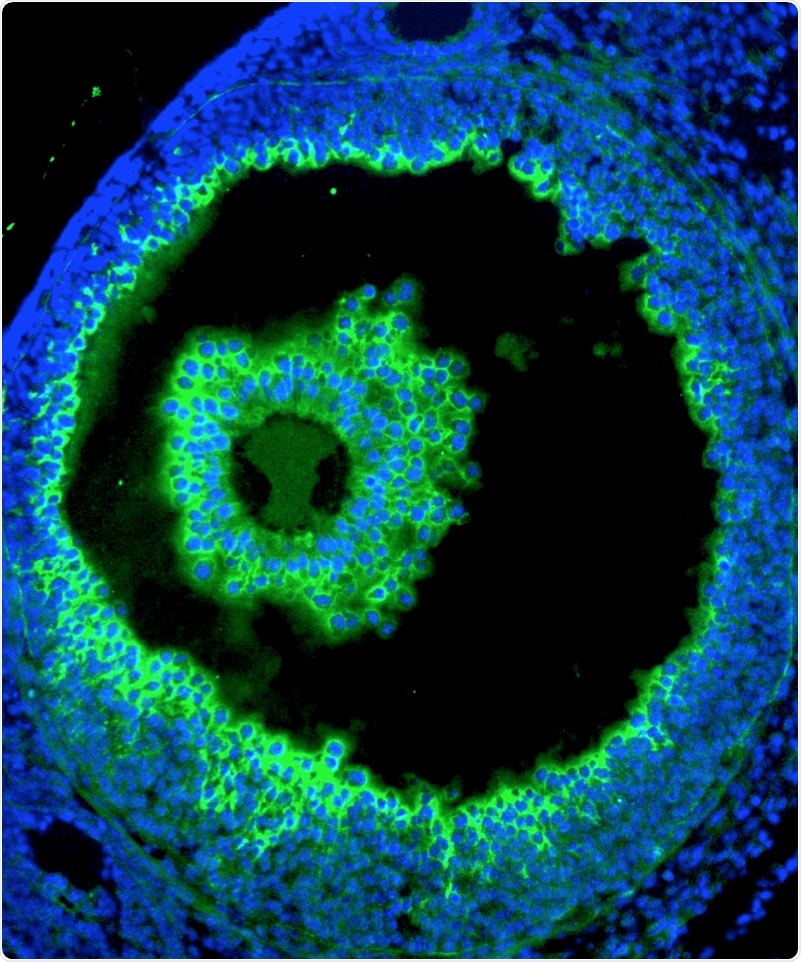Hyaluronic Acid staining with HABP (b-VG1 green) of an expanded cumulus oocyte complex within a mouse ovarian follicle; blue is DAPI staining. Image courtesy of Tony Day, University of Manchester, UK. Image credit: AMSBio