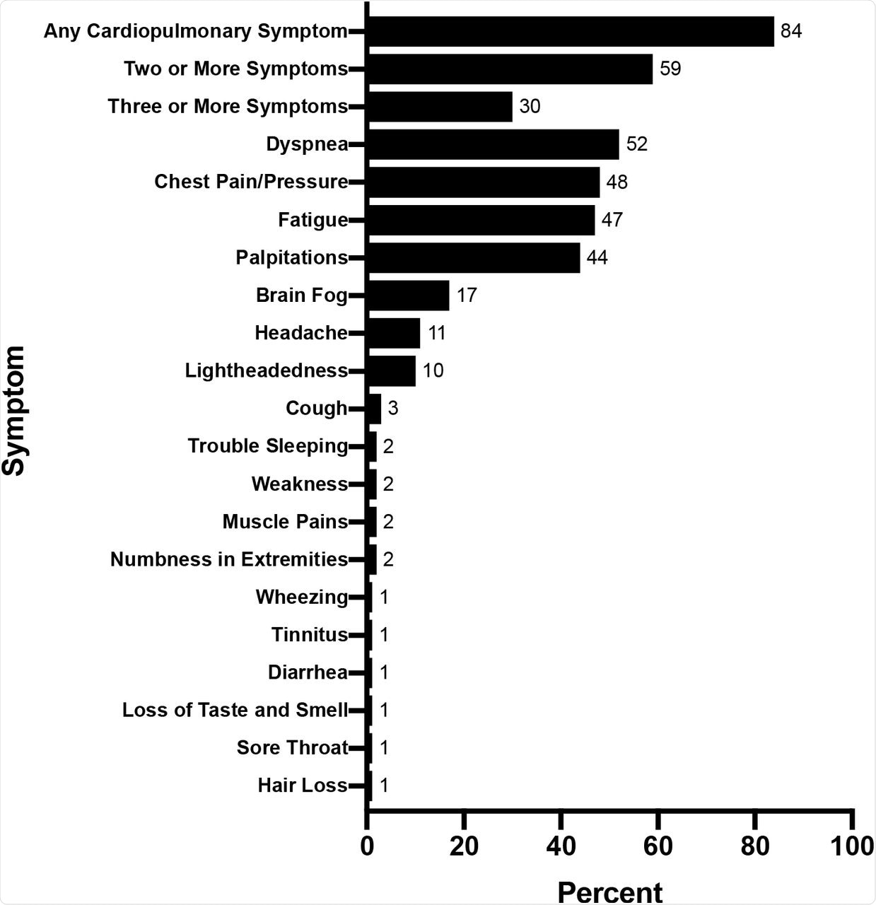 The patients also had comorbidities such as hypertension (23%), hyperlipidemia (25%), diabetes (17%), and obesity (37%), whereas 10% of patients had underlying cardiovascular disease and 32% had an underlying pulmonary or rheumatologic disease. The most common cardiovascular symptoms included dyspnea (52%), chest pain/pressure (48%), and palpitations (44%), with 84% of patients exhibiting at least one of these symptoms.