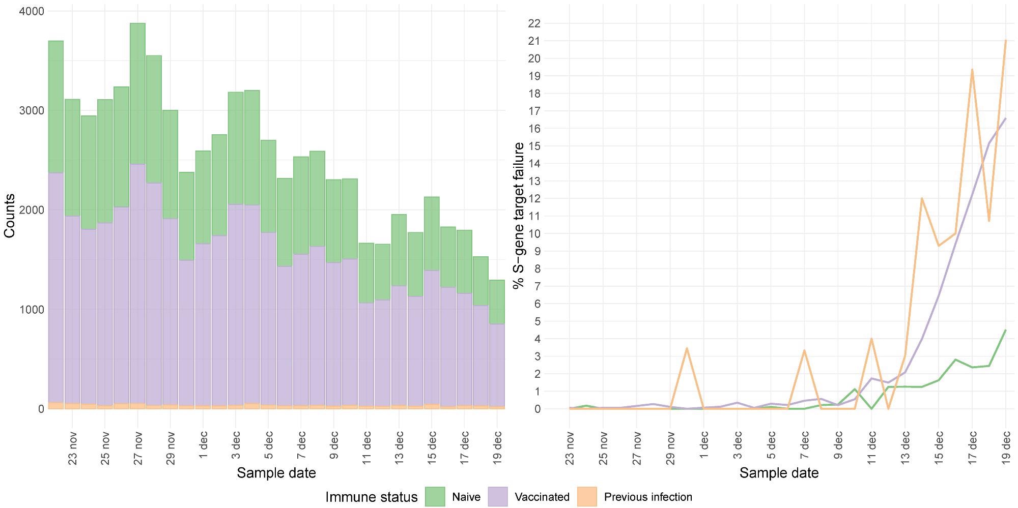 Children under 12 years of age were excluded since they were not yet eligible for vaccination in the study period. Among infected individuals, the researchers compared the percentage of SGTF between unvaccinated cases without a known previous infection (naïve), fully vaccinated cases without a known previous infection, unvaccinated cases with known previous infection. Furthermore, logistic regression was performed to estimate the association between immune status and SGTF, adjusting for the testing date, 10-year age group, and sex. An additional analysis was performed, where cases with a history of travel outside the Netherlands 14 days before symptom onset were excluded.