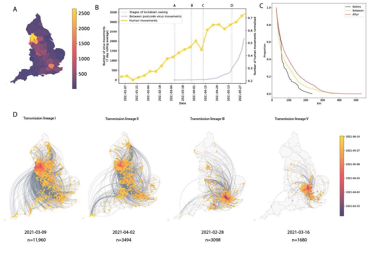 Introductions and regional dynamics of Delta transmission lineages. a) Number of independent introductions per UTLA in England based on continuous phylogeographic analysis of all Delta transmission lineages with >5 sequences. b) Trends in aggregate human mobility and the number of virus lineage movements among postcode districts. Letters denote stages of lockdown easing: A (2021- 03-08) schools reopen and limited mixing between households outdoors permitted; B (2021-03-29) “Stay at home” directive lifted, more outdoor mixing allowed (up to six people from two households; C (2021- 04-12) non-essential retail re-opened, outdoor dining permitted, holiday lets and campsites re-open; D (2021-05-17) indoor hospitality opens, indoor mixing permitted. c) Proportion of virus lineage movements between postcodes >25 km apart: y-axis denotes the proportion of movements that are less than or equal to the value on the x-axis. This is shown for movements before lockdown easing on 12th April (blue), between 12th April and 17th May (yellow) and after 17th May (red). d) Virus lineage movements inferred by continuous phylogeographic analysis for four large transmission lineages (see transmission lineages IV-VII in Extended Data Fig. 5). Direction of lineage movement is anti-clockwise, and dots represent the start and end points of movement, coloured by inferred date. The size and inferred TMRCA of each lineage is shown below each map.