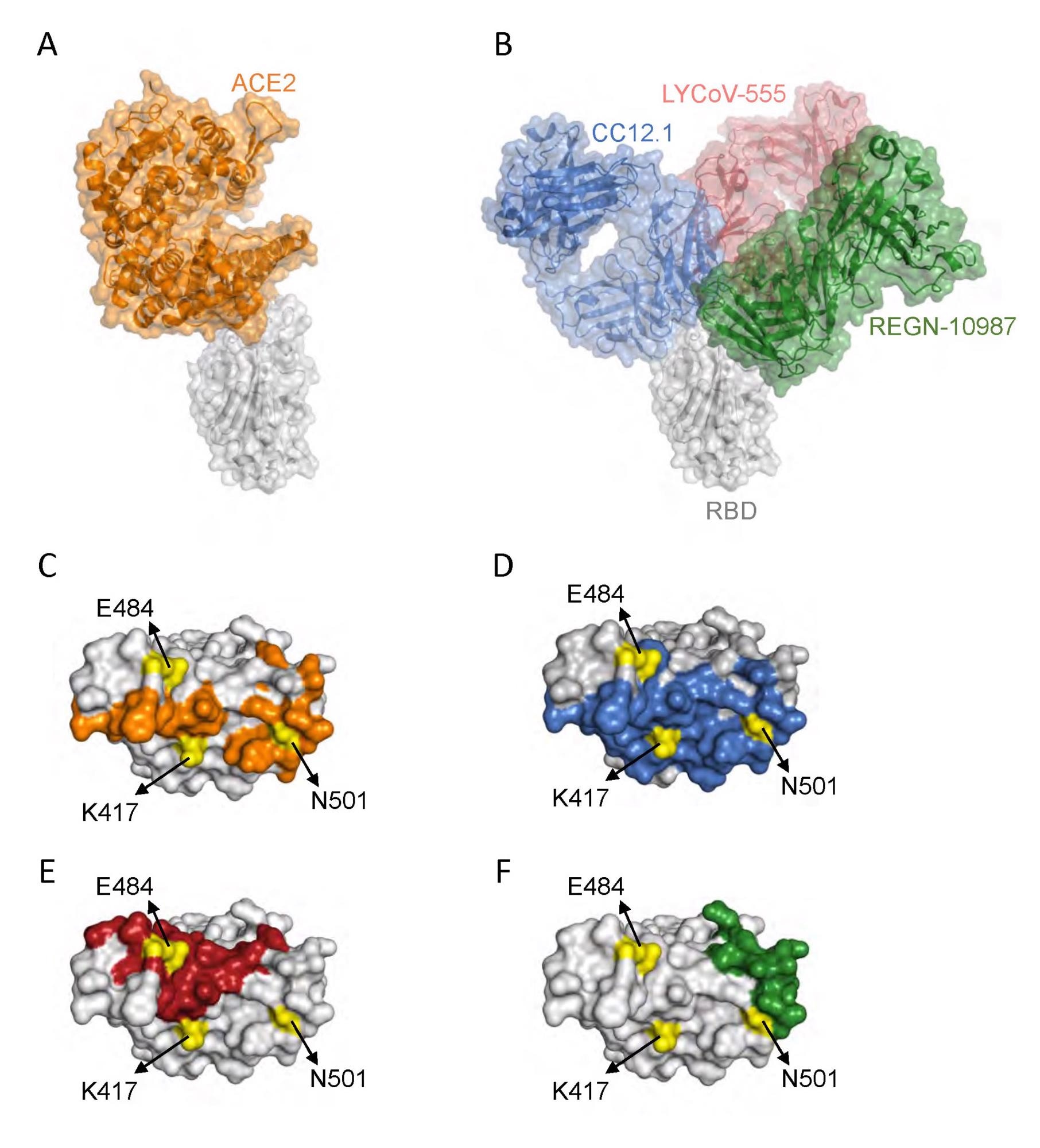 Interaction of SARS-CoV-2 RBD with ACE2 and neutralizing antibodies. (A) Protein structures showing interaction of RBD (gray) with ACE2 (orange) (Protein Data Bank (PDB) ID: 6m0j.pdb). (B) Protein structures showing interaction of RBD with a class 1 antibody Fab, CC12.1 (blue) (PDB ID: 6xc2.pdb), a class 2 antibody Fab, LYCoV-555 (red) (PDB ID: 7kmg.pdb), and a class 3 antibody Fab, REGN-10987 (green) (PDB ID: 6xdg.pdb). (C-F) The RBD residues that interact with ACE2 (orange), CC12.1 (blue), LYCoV-555 (red) and REGN-10987 (green). The position of RBD amino acid residues mutated in Gamma variant are shown in yellow.