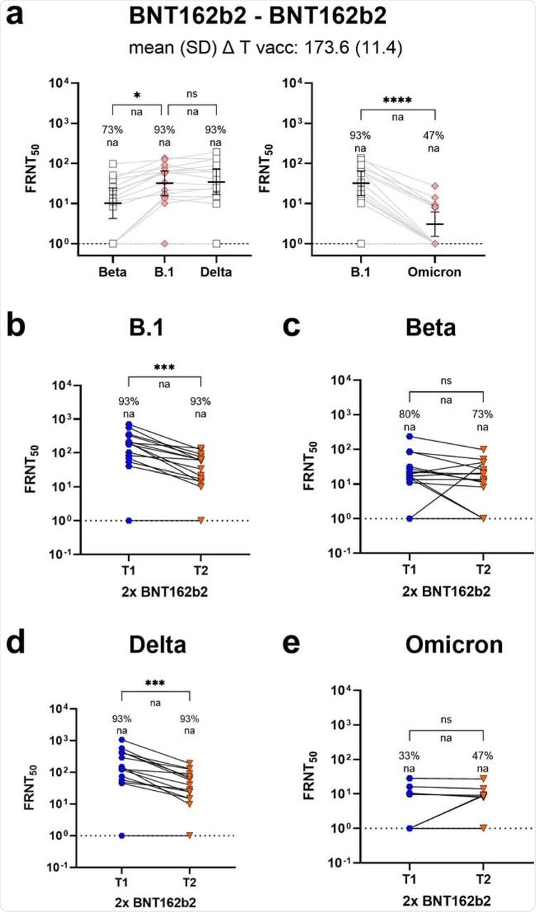 Paired sera from BNT162b2 vaccine recipients at four weeks and six months after the second dose allowed researchers to compare intra-individual titer changes over time. While the neutralization of the SARS-CoV-2 B.1 and Delta strains decreased significantly over time, the time-dependent reduction was less pronounced for the Beta and Omicron VOCs.