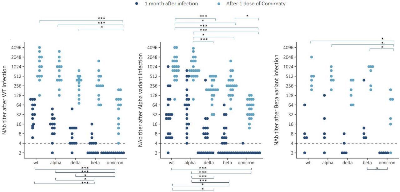 Neutralizing antibody (NAb) titers to wild-type (WT) virus and 4 variants Alpha (B.1.1.7), Delta (B.1.617.2), Beta (B.1.351) and Omicron (B.1.1.529) 1 month after infection with WT, Alpha or Beta variant and after one dose of Comirnaty COVID-19 vaccine. Wilcoxon rank-sum test *=P<0.05, **=P<0.01, ***=P<0.001.