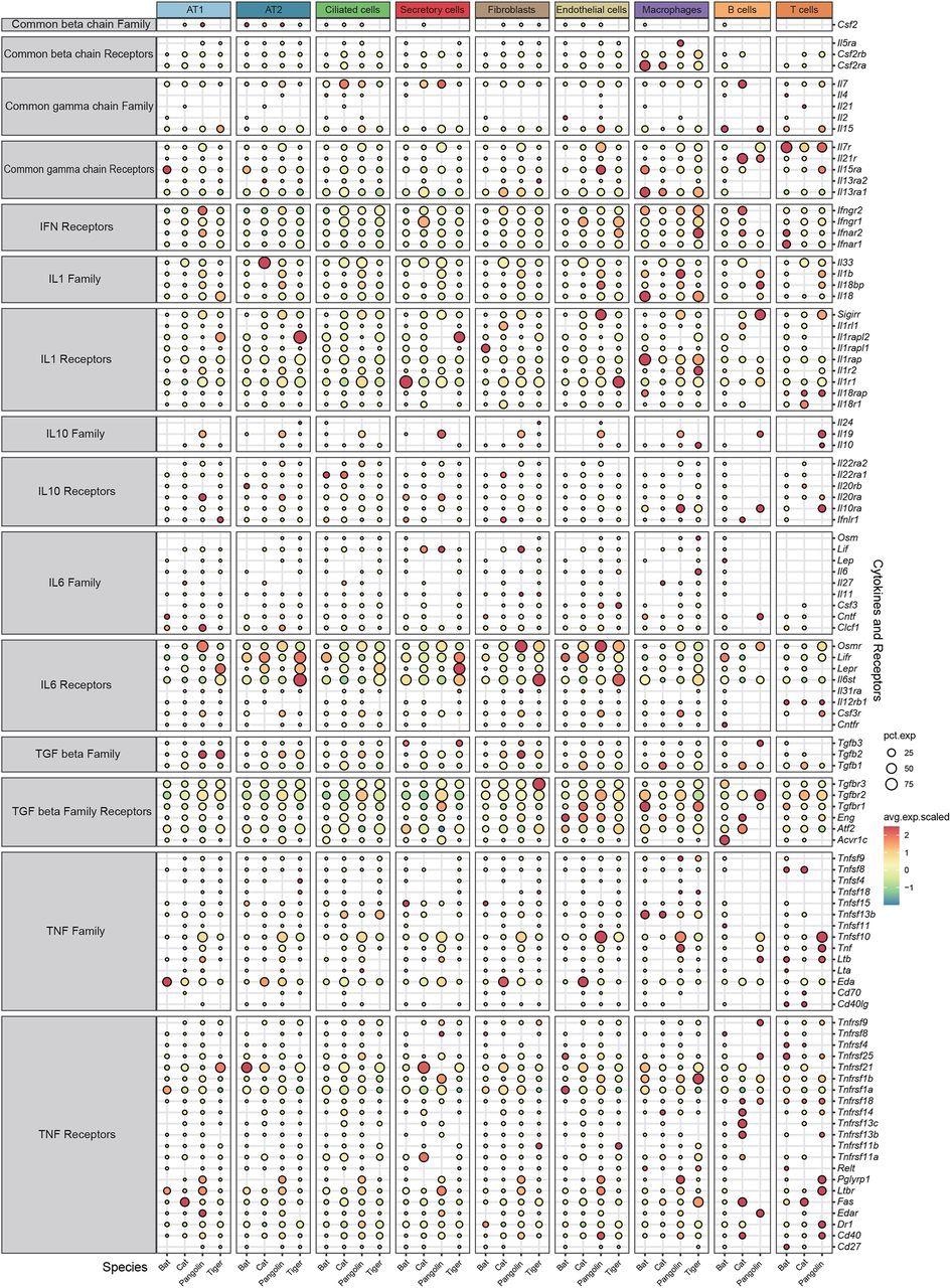 The scientists found that, compared to pangolins, tigers, and cats, Itgb5, a receptor of adenoviruses, was abundantly present in bat AT1 and Anpep, a receptor of human coronavirus 229E, was enriched in bat AT2. However, Cd86, also an adenovirus receptor, was abundantly found in the macrophages of bats, pangolins, and tigers. Cdhr3, a rhinovirus receptor, was primarily found in the ciliated cells of both bat and cat. Rpsa is another adeno-associated virus receptor, was found to be significantly expressed in tiger pulmonary cells except in T and B cells.