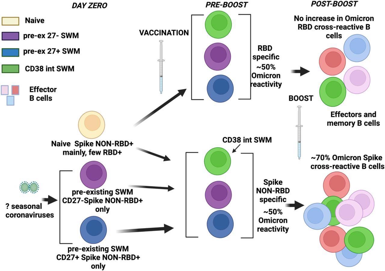 Boosting did not increase the frequency of RBD-binding B cells that recognize Omicron’s RBD. However, it did induce differentiation and expansion of pre-existing switched memory B cells such as CD27+ and CD27- which held bind Omicron’s RBD. Additionally, a booster increased the frequency of wild-type spike-binding B cells that expand to target and bind Omicron.