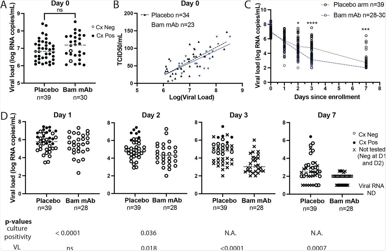 In the placebo group, the lowest viral load associated with a positive culture was 5.5 log10 RNA copies/mL, 64% of which were also found to be culture positive. Comparatively, all samples from the bamlanivimab cohort with equivalent viral loads were culture negative.