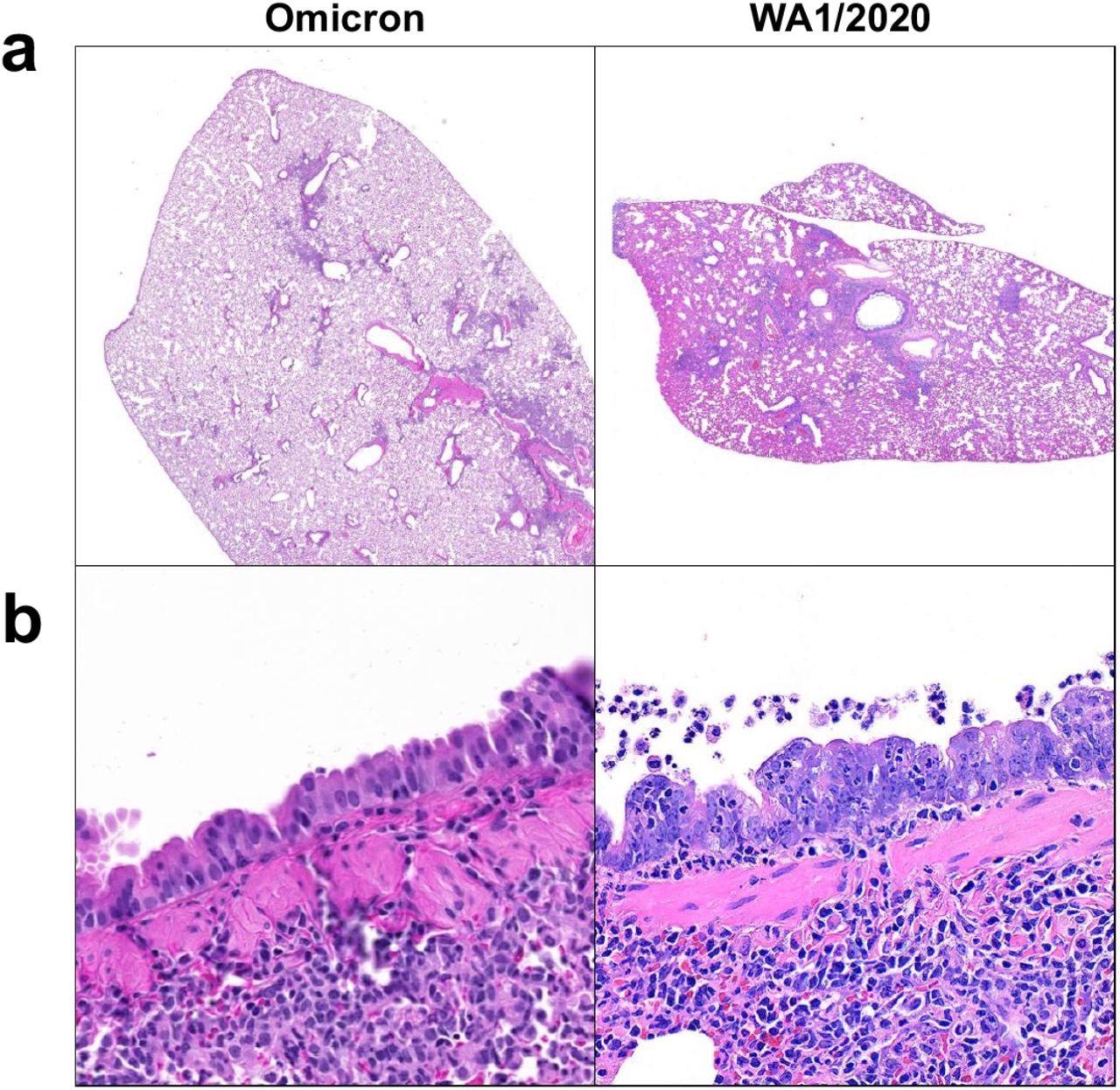 As expected, histopathologic studies show multifocal interstitial inflammation and pneumonic changes in lung tissue on day 4, with degeneration of the bronchial epithelium, loss of cilia and no nuclear polarity, with sloughing of cells, irrespective of infecting variant. Vascular involvement with inflammatory infiltrates and endotheliitis, was observable for both.