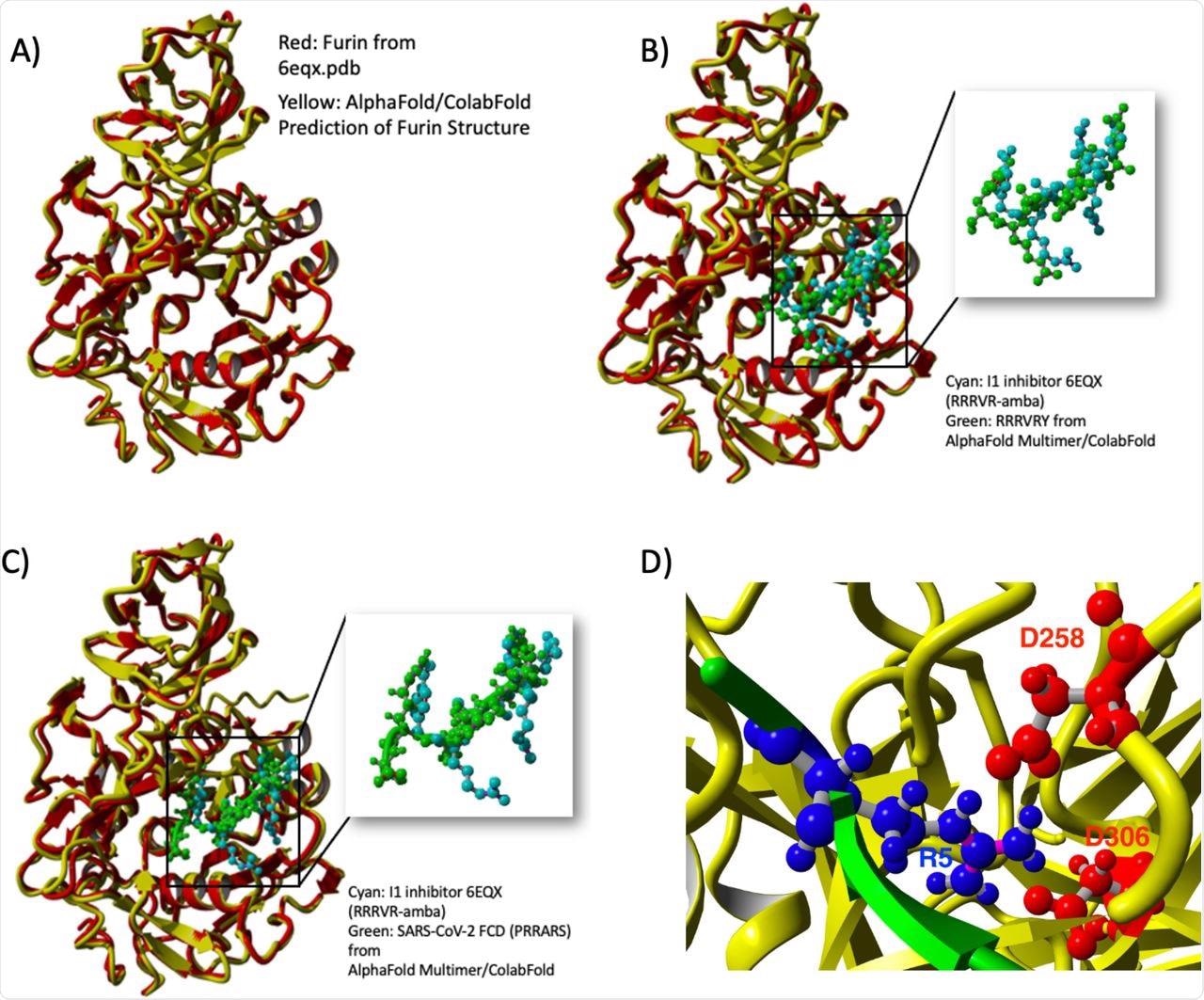 Taking the AlphaFold approach, the researchers concluded that the fifth amino acid in 93% of observed SARS-CoV-2 furin-FCD sequences from position 681, was arginine (Arg), a mutation in which was critical for stronger FCD-furin binding. In addition, the heat maps showed the importance of the fifth residue, which bound the S1 pocket of furin containing two aspartic acid residues, which was a structurally better fit for Arg than Lysine (Lys).