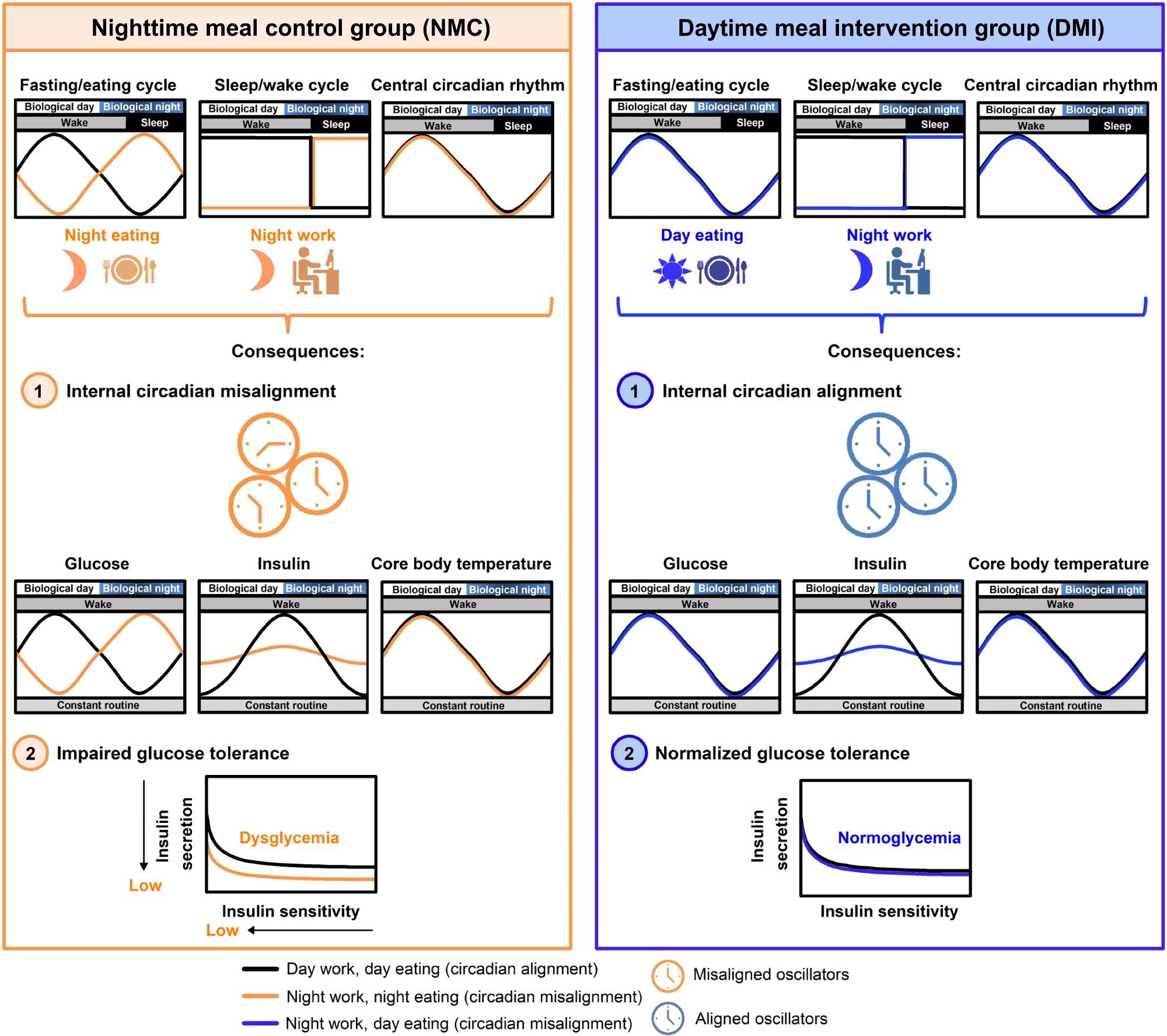 Our study shows that daytime eating, despite mistimed sleep, maintains internal circadian alignment and prevents glucose intolerance. While the direct translation of our findings into real-life settings is limited because of the stringently controlled nature of our study, we would recommend that night workers reconsider the amount of food (particularly carbohydrates) they eat in the nighttime.