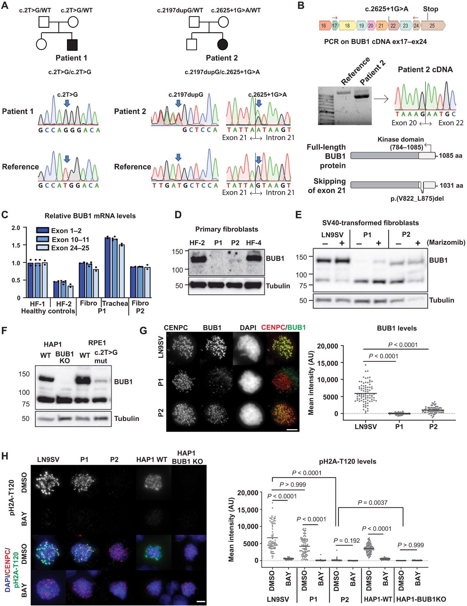 Biallelic germline mutations in BUB1 cause reduced protein levels.(A) Family pedigrees (based on WES) and Sanger confirmation from primary fibroblasts. Nomenclature NM_004336.5. (B) P2 primary fibroblast cDNA was PCR-amplified using indicated primers (red arrows) and analyzed on agarose gel and by Sanger sequencing. The transcript lacks exon 21. Predicted effect on BUB1 protein is shown. (C) BUB1 mRNA was assessed in indicated cells using three different primer pairs, each in three technical replicates. (D and E) Western blot of primary fibroblasts (D) (using A300-386A to detect BUB1) and SV40-transformed fibroblasts (E) (using ab9000). CDC6 is a control for marizomib-induced protein stabilization (6 hours, 500 nM). (F) Western blot of engineered RPE1-BUB1 mutant cells and complete BUB1 KO HAP1 cells using ab9000. (G) Colchicine-arrested cells (10 μM, 2 hours) were stained for CENPC, BUB1 (using A300-386A), and DNA. Graph depicts mean BUB1 intensity within CENPC-defined regions. n = 83, 73, and 72 cells from three independent experiments. (H) Colchicine-arrested cells, treated with BUB1 kinase inhibitor BAY1816032 (4 μM, 1 hour) or dimethyl sulfoxide (DMSO), were stained, and mean pH2A-T120 intensity was assessed within DAPI-defined regions. Approximately 90 cells from three independent experiments were analyzed per condition. Each dot represents one cell; black lines indicate the means. Scale bars, 5 μm. Nonparametric Kruskal-Wallis test (Dunn’s multiple comparison test) used for statistical analysis. AU, arbitrary units; aa, amino acid.