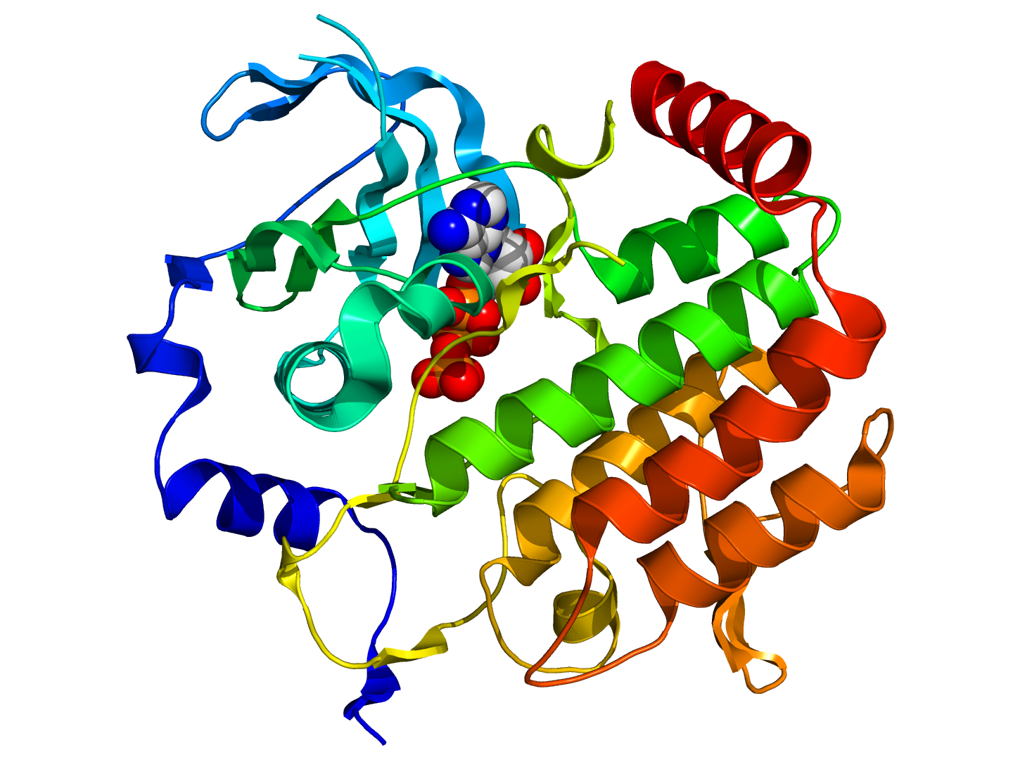 Crystallographic structure of the human kinase BUB1 (rainbow colored cartoon, N-terminus = blue, C-terminus = red) complexed with ATP (spheres, carbon = white, oxygen = red, nitrogen = blue, phosphorus = orange). Image Credit: Boghog2 - Own work, Public Domain, https://commons.wikimedia.org/w/index.php?curid=10167348