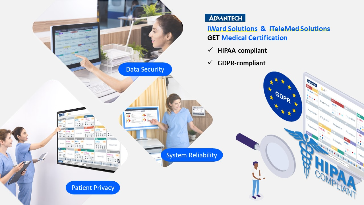 Advantech, a global leader of industrial IoT, is pleased to announce that its intelligent ward (iWard) and telehealth (iTeleMed) solutions have achieved Health Insurance Portability and Accountability Act (HIPAA) certification in the U.S. and General Data Protection Regulation (GDPR) certification in Europe. As the first healthcare software offerings produced in Taiwan to secure both HIPAA and GDPR compliance, Advantech iWard and iTeleMed solutions are expected to expand market demands for Taiwan’s intelligent healthcare solutions in Europe, the U.S., and Southeast Asia.