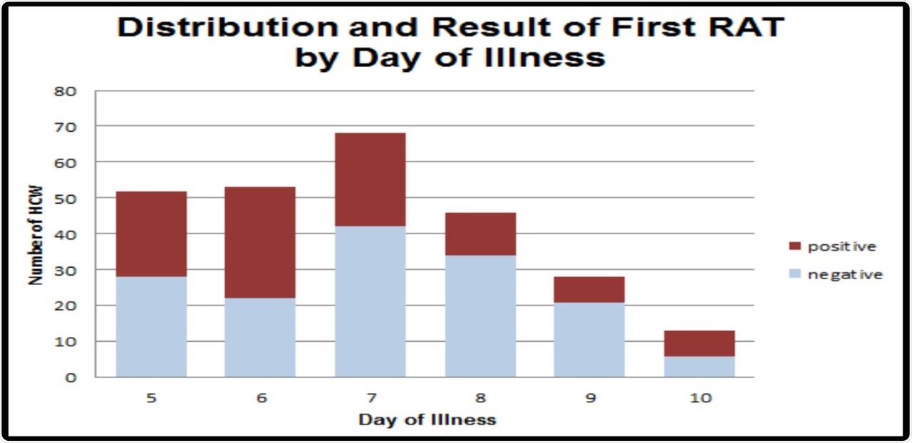 Quidell Quickview (San Diego, CA, USA) point of care RAT was performed on qualifying healthcare workers as soon as day five of their illness. Day 1 of illness was the start of symptoms or test date if asymptomatic.