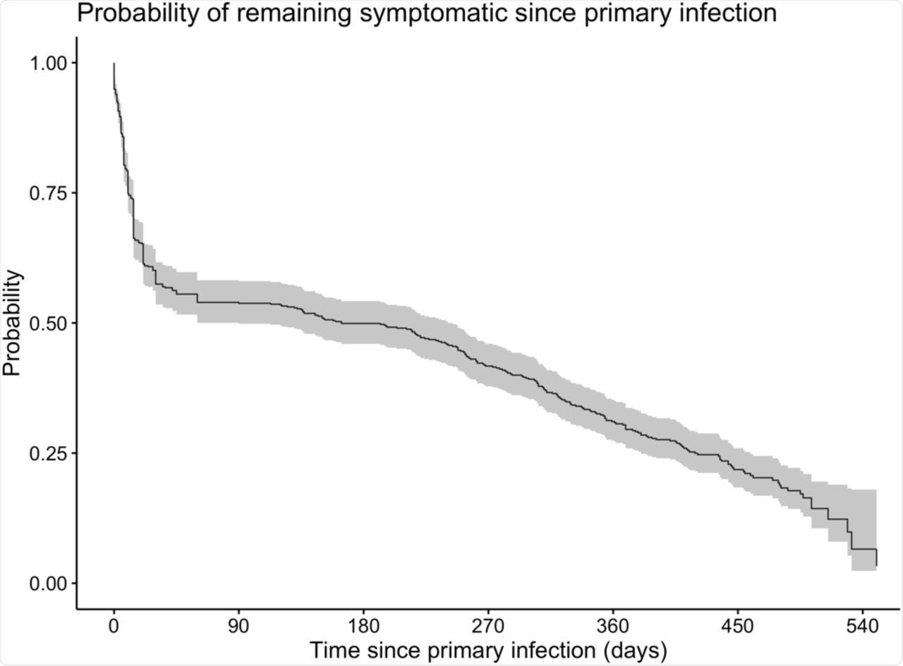Kaplan-Meier curve for the probability of reporting symptoms attributable to the primary infection as a function of time since primary infection.