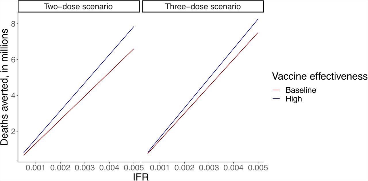 In a two-dose scenario, when IFR was 5/1000 and 5/10,000, the cost per death rate averted ranged from $7,200 to $71,700 respectively, while in a three-dose scenario, it ranged from $10,700 to $107,700 respectively. With the same parameter estimates, death averted ranged from 5 to 0.5 million in a two-dose scenario, and 4.7 million to 0.6 million in a three-dose scenario.