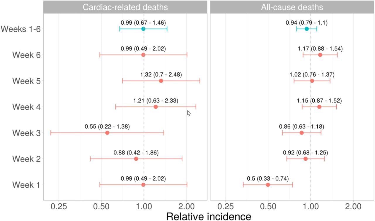 Following examination of the relative incidence of both categories of deaths, the results showed that there was no evidence of change in the risk of cardiac deaths in the first six weeks after vaccination, with the relative incidence resting at 0.99. Similarly, there was no evidence of change in the risk of any deaths in the first six weeks following vaccination, and a reduction in the risk of death for the first week following vaccination.