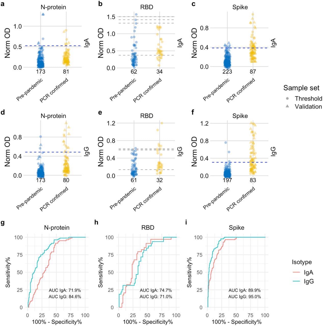 Distribution of semi-quantitative titres for each assay and corresponding ROC curves. a-c, Dotplots show the scatter of values for SARS-CoV-2 specific IgA responses and specific IgG responses in d-f. Data are presented for known negative and known positive samples, the number of samples tested in each group is shown under the corresponding data points. For N-protein and Spike, proposed thresholds (97th – 99th percentile and Youden’s index) are shown as dashed lines, with the final selected threshold in blue; thresholds were derived in the threshold setting phase (threshold samples shown as circles, validation samples shown as triangles). RBD was not taken forward to full evaluation, so performance in the threshold set and corresponding proposed thresholds are shown as dashed grey lines. g, i, ROC curves for N-protein and Spike represent assay performance determined on all threshold and validation set samples combined. h, The ROC curve for RBD represents assay performance in threshold sample set. ROC = receiver operating characteristic. AUC = area under the curve. Norm OD = Normalised OD (a relative ratio to the serum standard). N-protein = Nucleocapsid protein. RBD = Receptor binding domain.