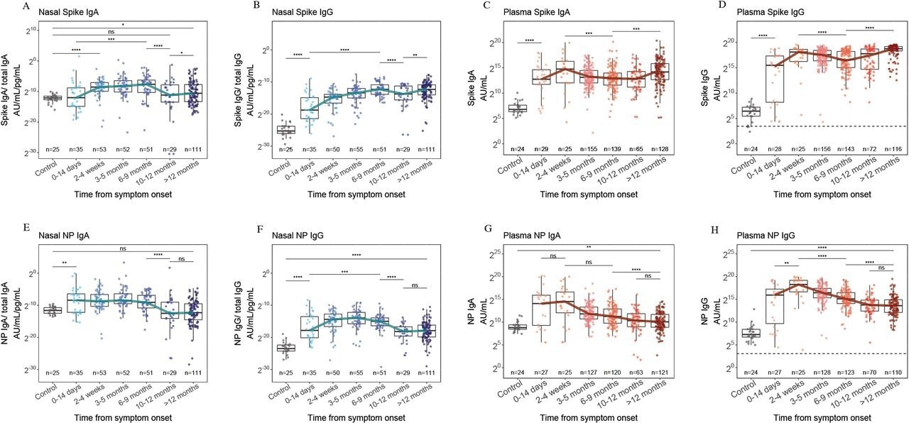In total, 569 and 356 plasma and nasal samples were obtained, of which 338 and 143 were obtained from the same person at different time intervals, respectively, and paired nasal and plasma samples obtained at the same time point were available for 174 persons. Robust nasal anti-NP and anti-S IgA titers were found within four weeks of symptom onset, which waned after nine months.