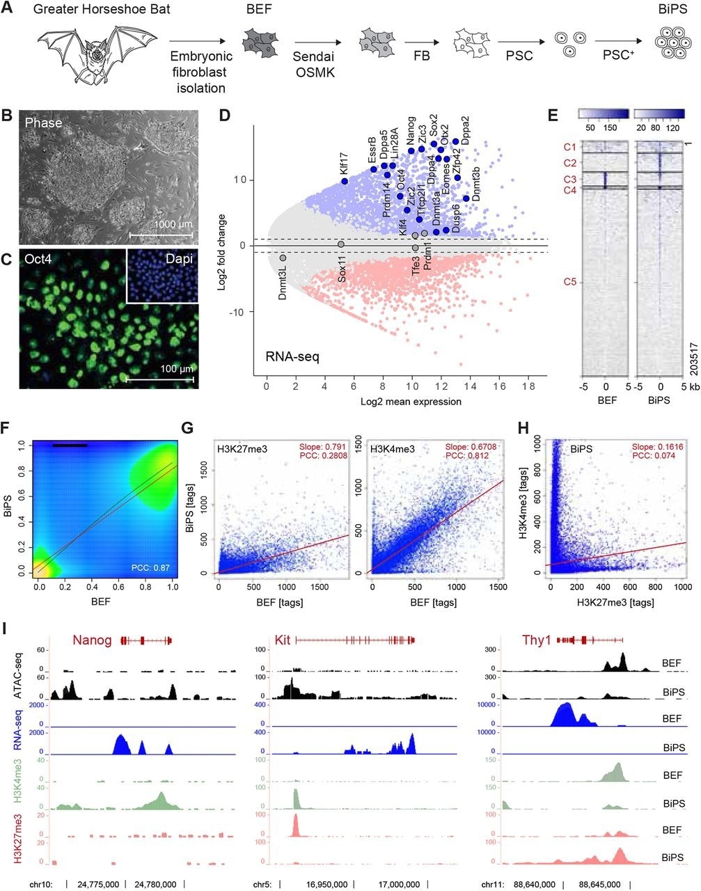 Derivation of pluripotent bat stem cells. (A) Illustration of the bat pluripotent stem cell derivation strategy. BEF, embryonic fibroblasts; OSMK, Oct4, Sox2, cMyc, Klf4; FB, fibroblast medium; PSC, pluripotent stem cell medium; PSC+, PSC with additives. (B) Morphology of established BiPS cell colonies grown on mouse embryonic fibroblasts. (C) Immunofluorescent detection of Oct4 in BiPS cells. (D) MA plot of RNA-seq data illustrating the transcriptional differences between bat embryonic fibroblast (BEF) and pluripotent stem cells (BiPS). Selected genes with known functions in the establishment or maintenance of pluripotency are highlighted. (E) Kmean cluster analysis of ATAC-seq signals obtained from BEF or BiPS cells. C, cluster. (F), Density plot of RRBS results obtained from BEF and BiPS cells. PCC, Pearson correlation coefficient. (G) Scatter plots of histone 3 methylation status at K4 (activating chromatin modification) or K27 (repressing chromatin modification) after ChIP-seq from BEF or BiPS cells as indicated. (H)Scatter plot of H3K4me3 and H3K27me3 in BiPS cells illustrating the occurrence of bivalent chromatin sites in BiPS cells. (I) RNA-seq, ATAC-seq and H3K4me3 or H3K27me3 ChIP-seq signals of selected genes with known roles in reprogramming that are activated (Nanog, Kit) or repressed (Thy1) in BiPS when compared to BEF cells.