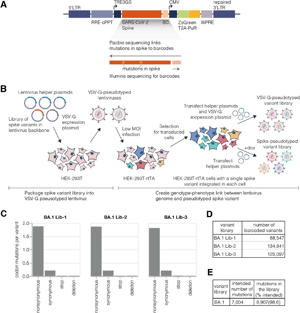 Deep mutational scanning platform for spike. (A) Lentivirus backbone used for deep mutational scanning. The backbone contains functional lentiviral 5’ and 3’ long terminal repeat (LTR) regions. The spike gene is under an inducible tet response element 3rd generation (TRE3G) promoter, and there is a 16 nucleotide barcode (BC) downstream of the stop codon. A CMV promoter drives expression of reporter ZsGreen gene that is linked to a puromycin resistance gene (PuR) via a T2A linker. The backbone also contains a woodchuck hepatitis virus posttranscriptional regulatory element (WPRE), Rev response element (RRE), and a central polypurine tract (cPPT). (B) Approach for creating genotype-phenotype linked lentivirus libraries. HEK-293T cells are transfected with spike-carrying lentivirus backbone, VSV-G expression plasmid and lentiviral helper plasmids to generate VSV-G-pseudotyped lentiviruses. These viruses are used to transduce reverse tetracycline-controlled transactivator (rtTA) expressing HEK-293T cells at low multiplicity of infection (MOI), and successfully transduced cells are selected using puromycin. Selected cells can be transfected with helper plasmids and a VSV-G expression plasmid to produce VSV-G-pseudotyped viruses carrying all genomes present in the deep mutational library or selected cells can be induced with doxycycline (dox) to express spike and transfected with only the helper plasmids to generate spike-pseudotyped lentiviruses that have a genotype-phenotype link. (C)Average number of mutations per barcoded spike in BA.1 libraries. (D) Total number of barcoded variants in each BA.1 library. (E) The coverage of intended mutations across all BA.1 libraries.
