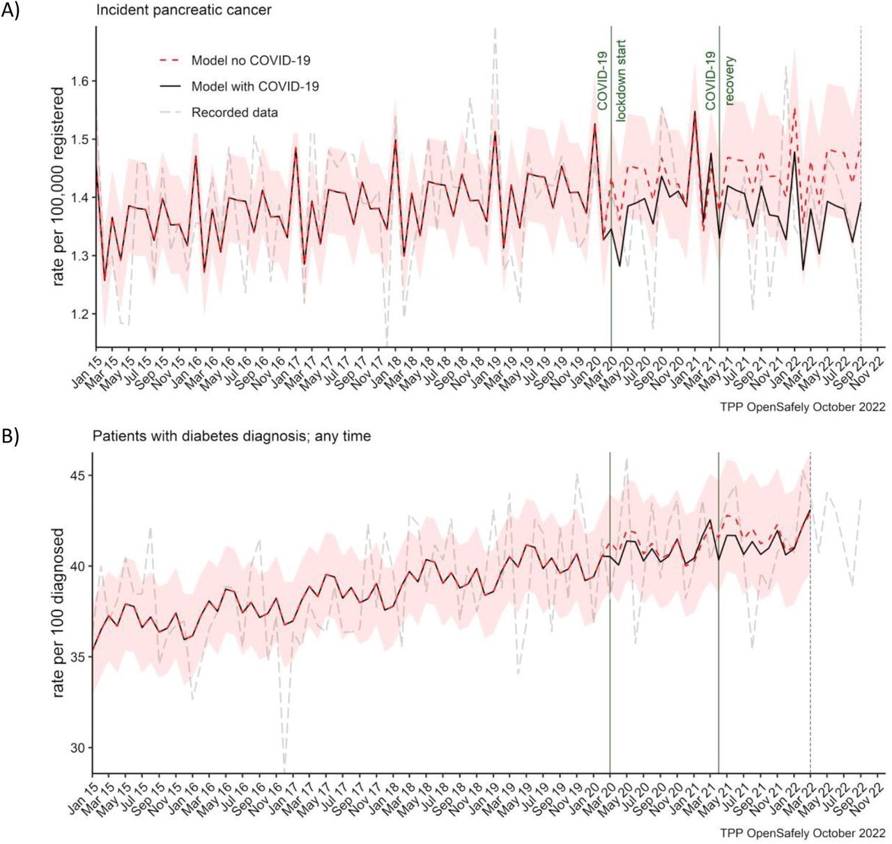 Observed and predicted monthly rates (as if the COVID-19 pandemic had not happened) for A) pancreatic cancer diagnosis per 100,000 registered patients, and B) diabetes diagnosis per 100 people with pancreatic cancer.