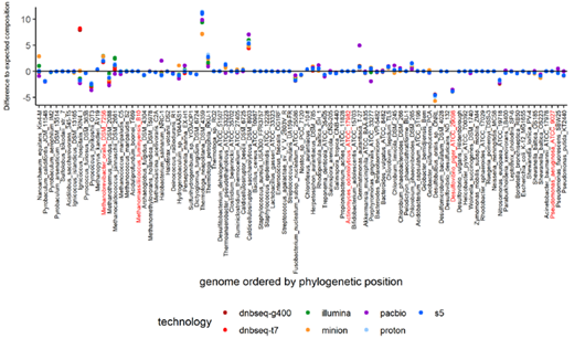 In addition, differential analysis between observed and excepted species abundances was performed in mock1. Results showed that over or under abundance estimation for most genomes had little to do with the sequencing platform, read length, taxonomy, GC-content, genome size and genome completeness, even at a low depth of 500,000 reads. In fact, most genomes were accurately estimated on all sequencers, with the observed normalized abundances generated by T7* charting very close to the excepted values.