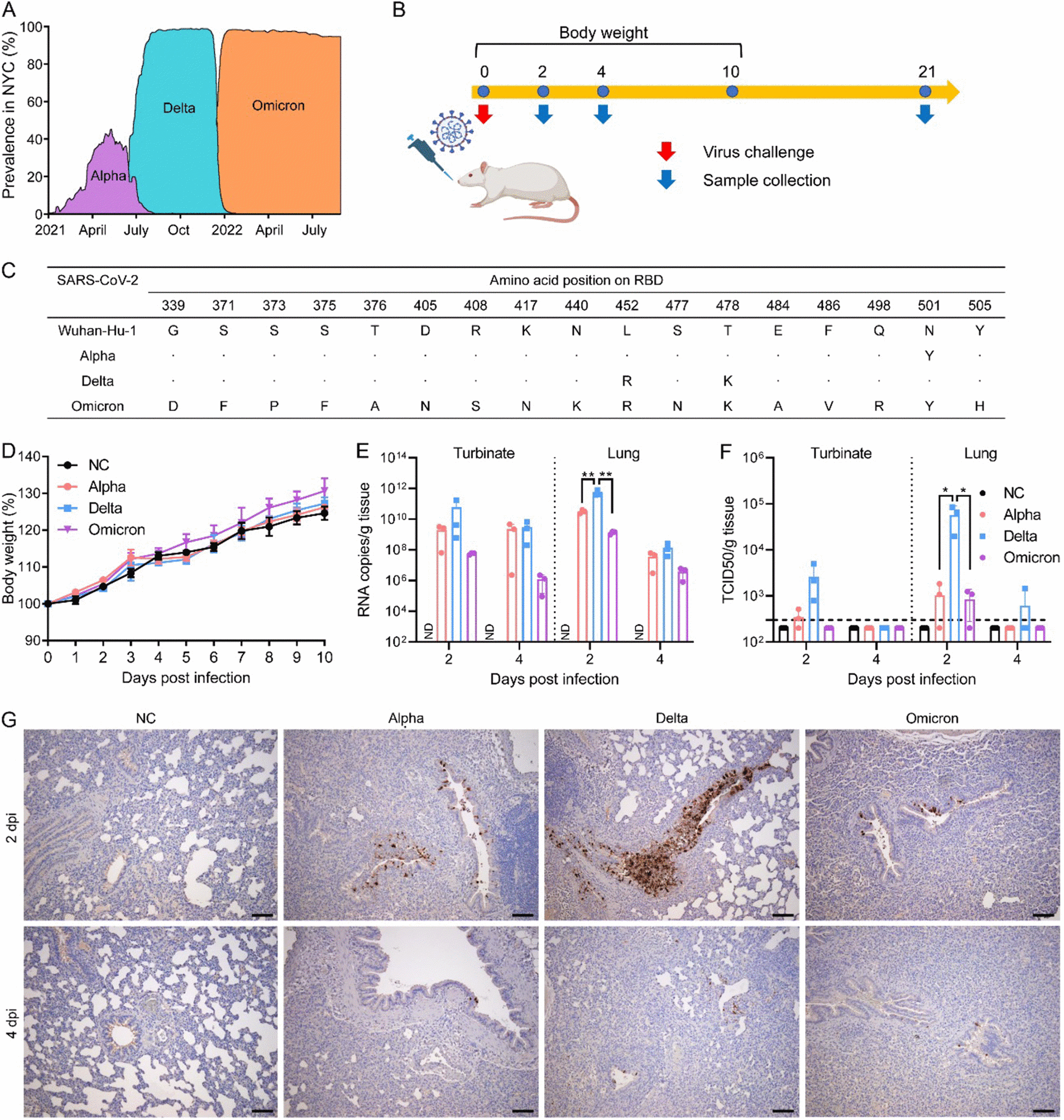 Sprague Dawley (SD) rats are susceptible to infection with Alpha, Delta, and Omicron variants. (A) Prevalence of Alpha, Delta, and Omicron variants in NYC. Figure adapted from https://outbreak.info. (B) Scheme of the virus challenge experiment using 6-week-old SD rats. (C) Amino acid changes of Alpha, Delta, and Omicron variants across the receptor binding domain (RBD) compared to Wuhan-Hu-1 (NCBI access no. MN908947.3). (D) Body weight of rats mock-infected or infected with either Alpha, Delta, or Omicron variant. (E and F) Viral RNA copies (E) and infectious viral titers (F) in the turbinate and lungs from rats infected with either Alpha, Delta, or Omicron variant at 2 or 4 days postinfection (dpi). *, P < 0.05; **, P < 0.01. (G) Detection of SARS-CoV-2 nucleocapsid protein in bronchial epithelial cells by immunohistochemistry at 2 and 4 dpi. Scale bar = 100 μm.