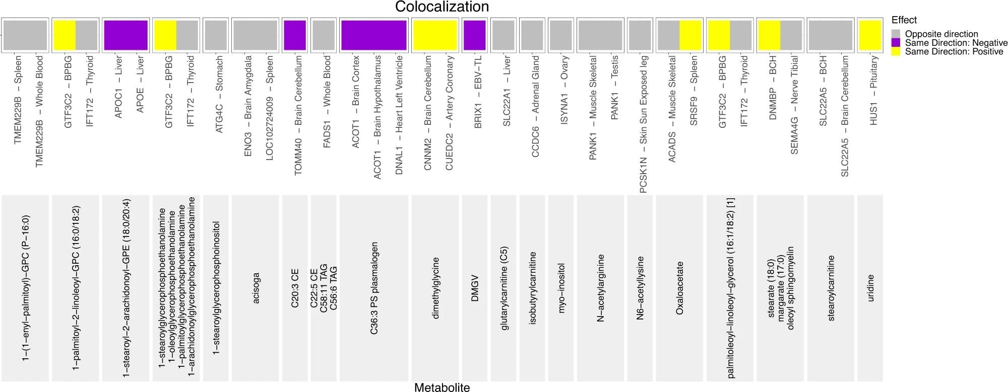 The direction of the effect of minor allele on metabolite levels and gene expression is shown in the legend. At the bottom of the graph, in light gray, are the names of the metabolites. Above the names of metabolites are eQTL gene-tissue pairs. If both the effect of minor allele on metabolite levels and on gene expression is more than 0, such variant-metabolite-gene eQTL combinations are marked in yellow and annotated as “Same Direction: Positive”. If the effect of minor allele on metabolite levels and on gene expression is less than zero, such variant-metabolite-gene eQTL combinations are marked in purple and annotated as “Same Direction: Negative.” If the effect of minor allele on metabolite levels is less than zero and the effect of minor allele on gene expression is more than zero, or vice versa, such variant-metabolite-eQTL combinations are marked in gray and annotated as “Opposite Direction”. Additionally, the following acronyms were used for tissues: BPBG brain putamen basal ganglia, BCH brain cerebellar hemisphere, EBV-TL - Cells EBV-transformed lymphocytes.